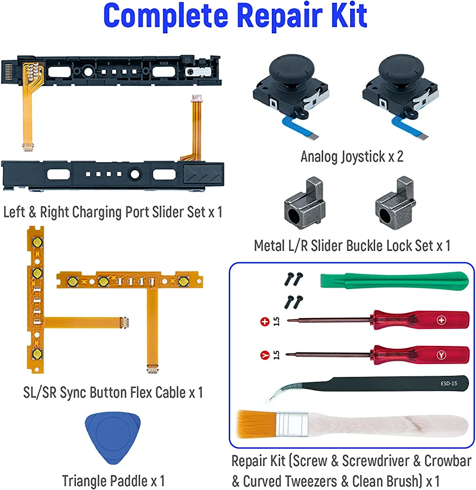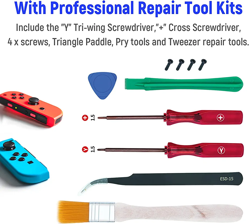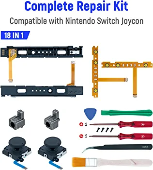 Introducing the Mcbazel 18 in 1 Replacement Repair Kit for NS Switch Joy-Con, the ultimate solution for all your Joy-Con repair needs. This comprehensive kit includes everything you need to replace and repair your Joy-Con, including screwdrivers, opening tools, 3D left and right analog joysticks, buckle locks, charging port sliders, button sync flex cable set, and more.