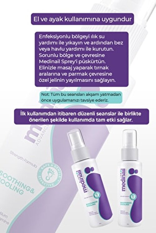 How to use MedInail Foot and Nail Spray? Spray the product using the applicator between all nails and fingers so that your feet and fingers are equal to 3-5 cm away. Apply an equal amount of the product to the entire foot area and between the fingers by rubbing and ensure that the product is absorbed by the skin.