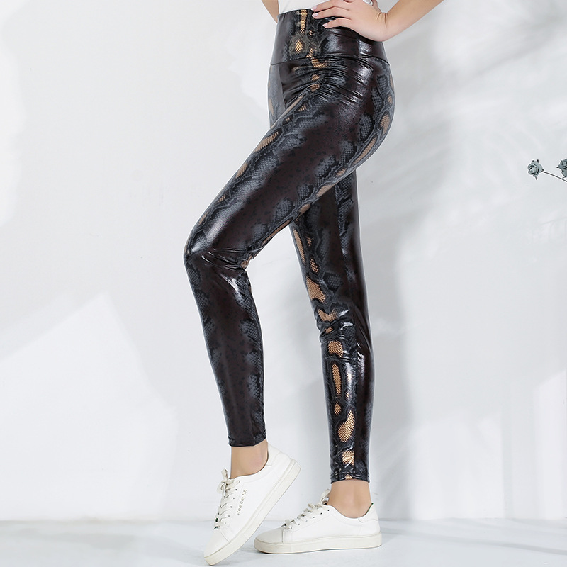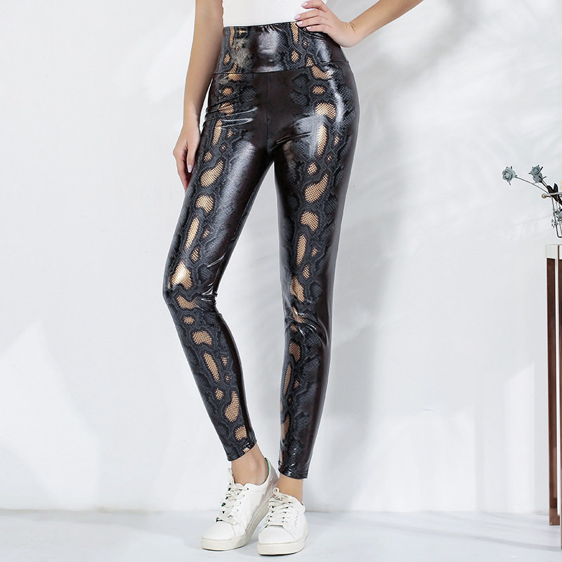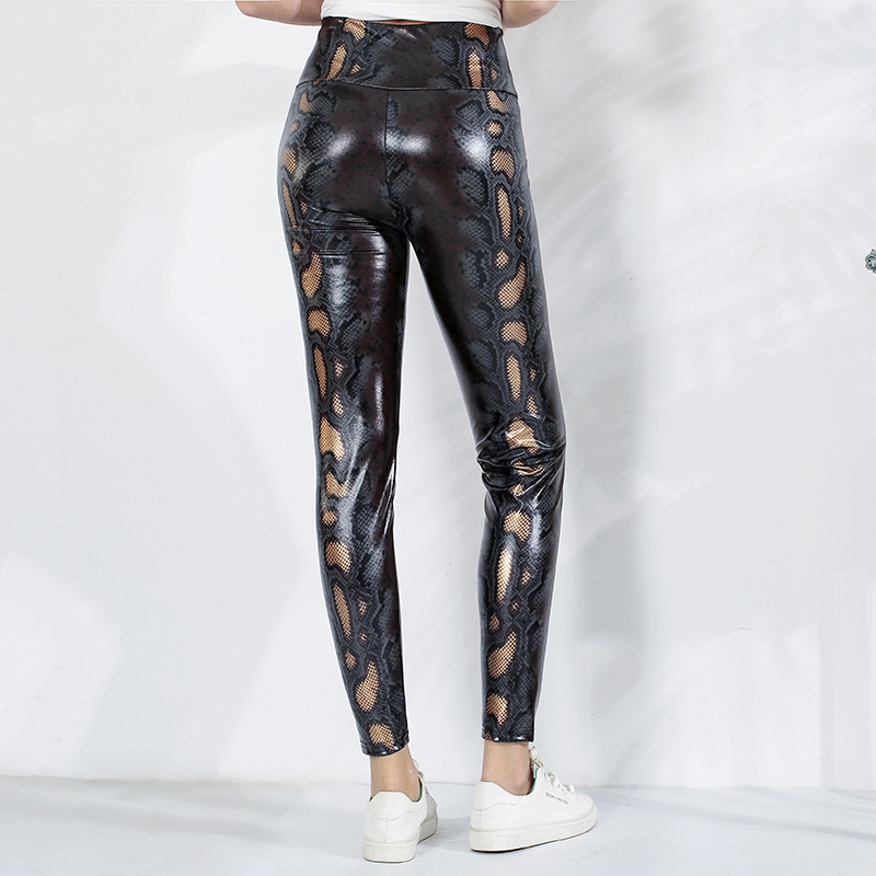 Meilaoshi real shot Brown pattern slim fit pencil pants women’s high waist corset waist snake pattern polyester casual leggings