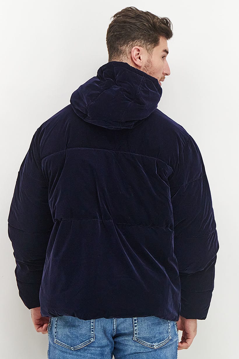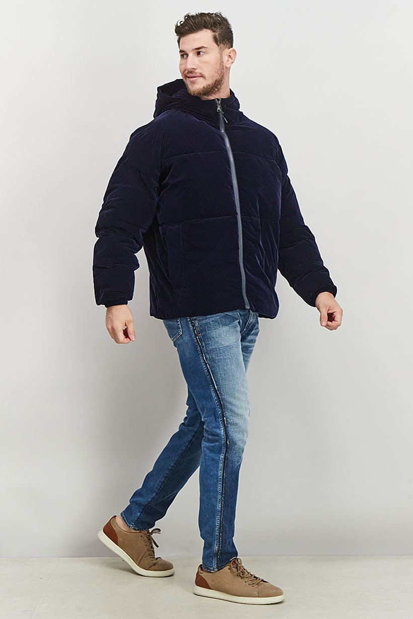 Men Plain Velvet Hooded Puffer Jacket, Navy