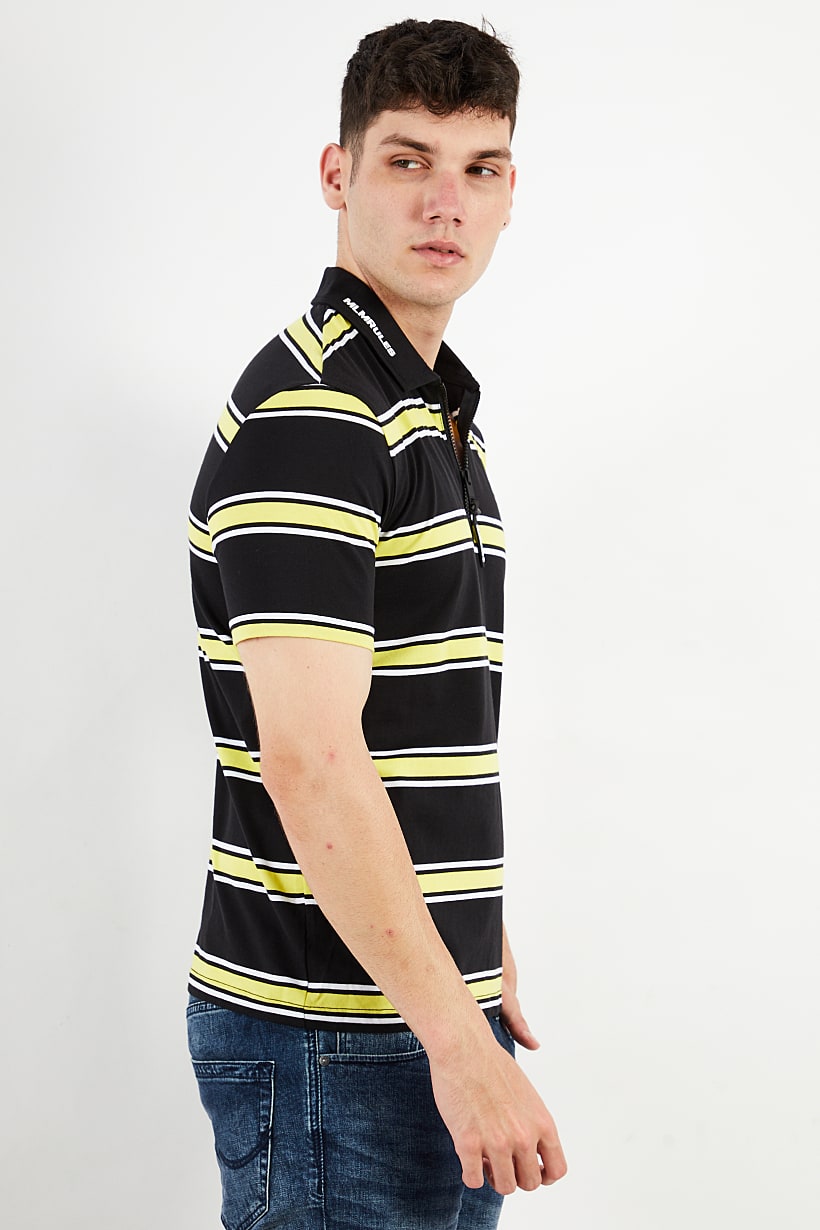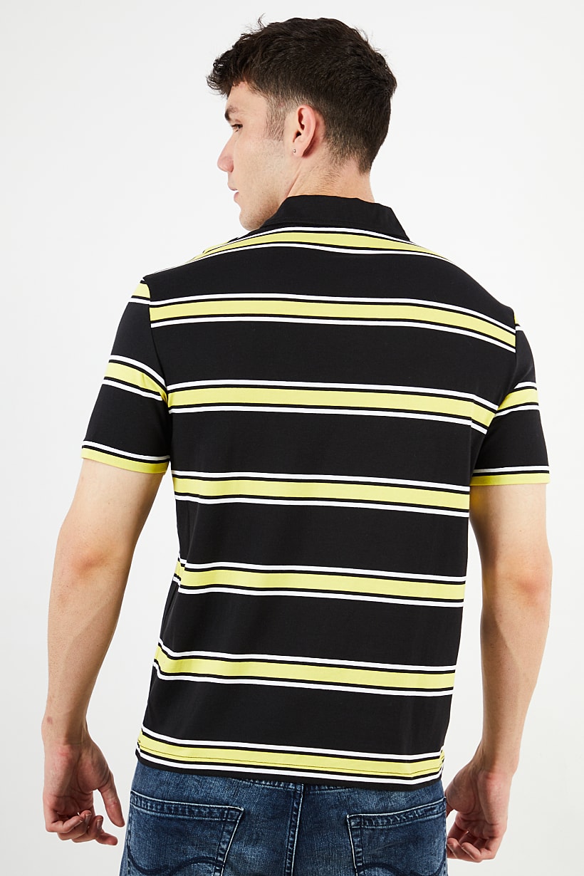 Men Regular Fit Stripe Zipper Polo Shirt, Black and Yellow