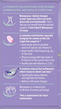 The One A Day Women’s Menopause Formula is a convenient tablet that offers various benefits. It is a complete multivitamin that contains natural Soy Isoflavones, which can help alleviate some menopause-related symptoms such as hot flashes and mild mood swings. Additionally, this multivitamin provides essential nutrients that support bone health, physical energy, skin health, and heart health. The formula includes Vitamins A, B6, B12, C, D, and E, Soy Isoflavones, Thiamin, Niacin, Riboflavin, Folic Acid, Pantothenic Acid, Calcium, Magnesium, Zinc, Copper, Manganese, Molybdenum, Biotin, Iodine, Selenium, and Chromium. It is recommended for adult women to take one tablet with food. One A Day Multivitamins can provide nutritional support for individuals at every life stage. However, it is important to note that this product is not intended to diagnose, treat, cure, or prevent any disease and should not be used as a replacement for heart medications.