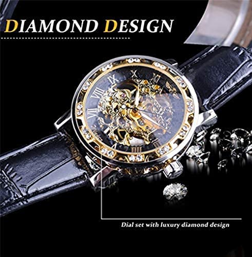 Automatic Mechanical Watches for Men, Retro Manual Mechanical Skeleton Watch with Diamond and Carving Flower Craft, Luxury Skeleton Wrist Watch Mechanical Classic Roman Number, Cutout Rhinestones