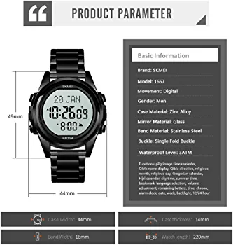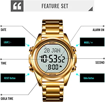 | nameOriginal | Digital Watch for Prayer Qibla Compass Hijri Calendar Bookmark City Selection Function Date Week Alarm Backlight 3ATM Waterproof Men Azan Watches Wristband Men's Gifts  |
