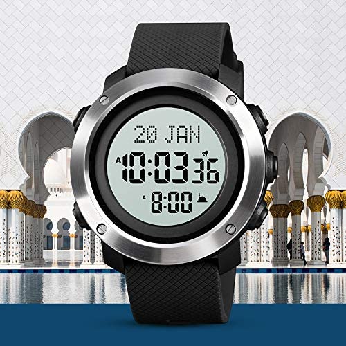 Introducing the Digital Watch for Prayer, the ultimate timepiece for devout Muslims. This watch features a Qibla compass, allowing you to easily determine the direction of Mecca for prayer. It also includes a Hijri calendar, so you can keep track of important Islamic dates and events.