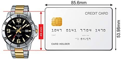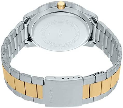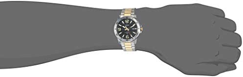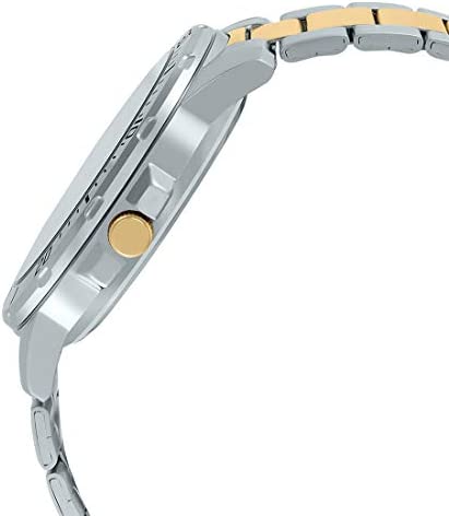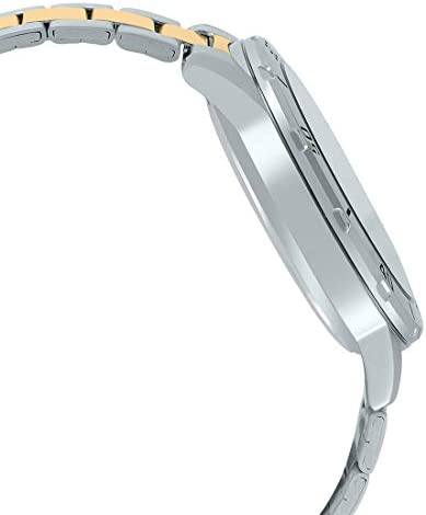 This product features a stainless steel band with a gold ion plated finish and a triple-fold clasp for secure fastening. The watch is water-resistant up to 50 meters and has a mineral glass face. It also includes a date display and regular timekeeping with three hands for hours, minutes, and seconds. The watch has an accuracy of ±20 seconds per month and a battery life of approximately three years on SR626SW.
