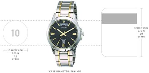 The Casio Enticer watch boasts a sophisticated and stunning appearance that will enhance your style. Its black dial is eye-catching and the stainless steel construction ensures long-lasting durability. The watch features a stainless steel case and bracelet that exude an elegant and polished look. The quartz movement provides accurate timekeeping for years to come. The mineral crystal glass and 50m water resistance rating make it suitable for any weather condition. The stainless steel bracelet with gold tones offers outstanding comfort for prolonged wearing. The watch is not only stylish but also durable and comfortable to wear. Its triple-fold clasp allows for easy installation and removal, while the 50m water resistance rating enables you to wear it in the rain.