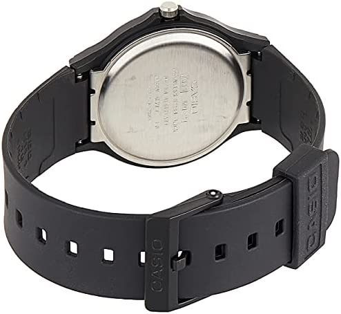The watch is made with a durable resin case and bezel, and comes with a matching resin band. The face is protected by a resin glass, and the watch is water resistant. It has regular timekeeping with three hands for hours, minutes, and seconds. The watch is accurate to within ±20 seconds per month and has a battery life of approximately three years with an SR626SW battery.