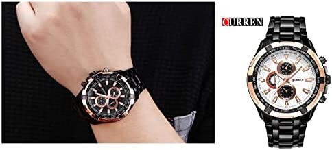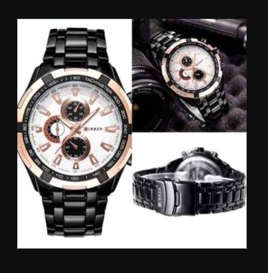 | nameOriginal | Men's Chrono Watch Stainless Steel Rose Gold Bezel Case White Dial 3 Subdials Black Stainless Steel Case, White |