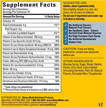 Nature Made Multi for Him Gummies are men's multivitamins that provide key nutrients to support men's health in delicious cherry and mixed berry gummies with other natural flavors to help fill potential nutrient gaps from your diet. Sourced from high-quality ingredients, these gluten-free Nature Made multivitamin for him gummies contain no synthetic dyes, no artificial flavors, no high fructose corn syrup, and no artificial sweeteners. This daily multivitamin for men helps support muscle health, immune health, and provides energy metabolism support (1). These Nature Made multivitamin gummies are specially formulated with key vitamins for men who want to fill their nutritional gaps and prefer gummy vitamins over tablets. Adults, chew two of these Nature Made men's multivitamin gummies daily. Nature Made supplements are quality you can trust. USP has tested and verified ingredients, potency, and manufacturing process. USP sets official standards for dietary supplements. Visit the USP verified website for more information. (1)Helps convert food into cellular energy.