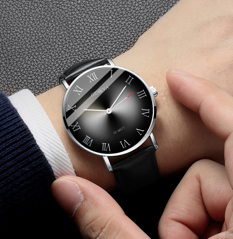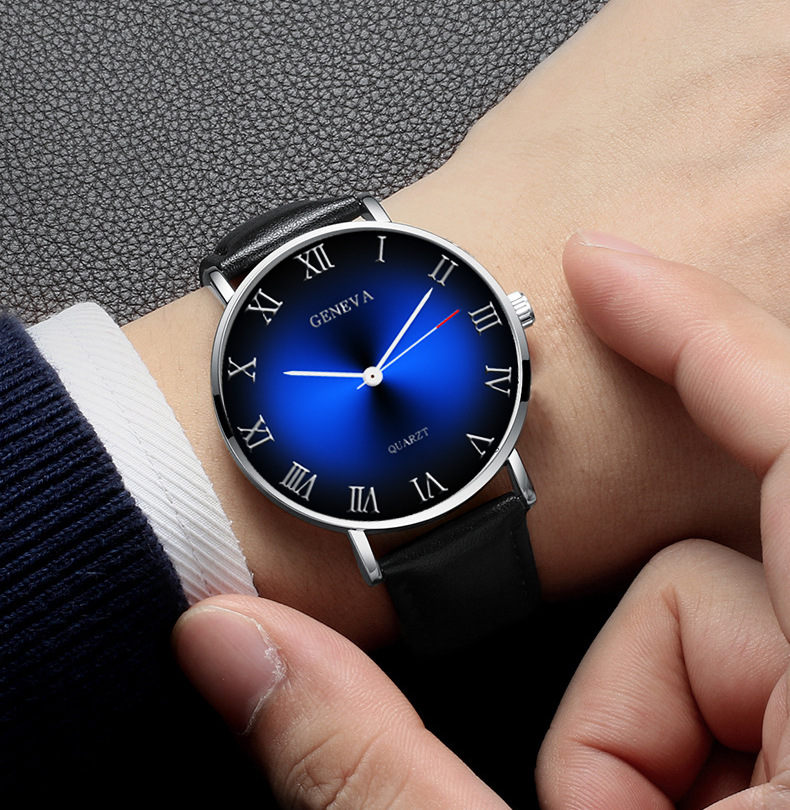 | nameOriginal | Men's leather belt simple Roman watch retro men's watch Personality pointer gradient color explosion eye business quartz couple watch |