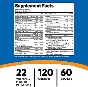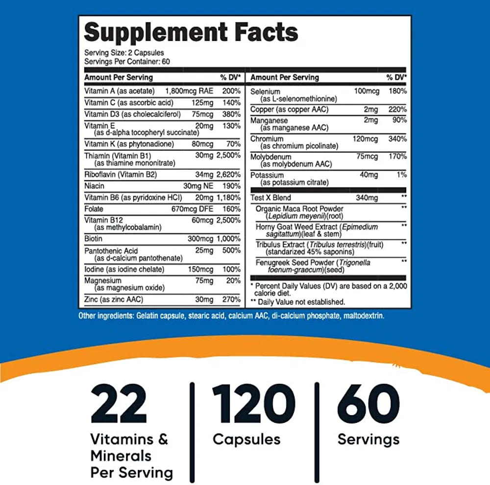 Over 20 Essential Vitamins & Minerals Formulated Specifically For Men's Health 1200mg Per Serving (60 Servings) 120 Capsules Per Bottle Non-GMO and Gluten Free Manufactured In a GMP Compliant, FDA Registered Facility Ingredients: Vitamin A, Vitamin C, Vitamin D3, Vitamin… Over 20 Essential Vitamins & Minerals Formulated Specifically For Men's Health 1200mg Per Serving (60 Servings) 120 Capsules Per Bottle Non-GMO and Gluten Free Manufactured In a GMP Compliant, FDA Registered Facility Ingredients: Vitamin A, Vitamin C, Vitamin D3, Vitamin E, Vitamin K, Thiamin, Riboflavin, Niacin, Vitamin B6, Biotin, Vitamin B5, Potassium, Calcium, Iodine, Magnesium, Zinc, Selenium, Copper, Manganese, Chromium, Molybdenum, Maca Root Powder, Epimedium, Tribulus Terrestris, Fenugreek Seed Powder, Gelatin, Silicon Dioxide, Titanium Dioxide, Blue #1, Red #3, Yellow #5