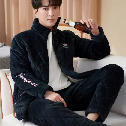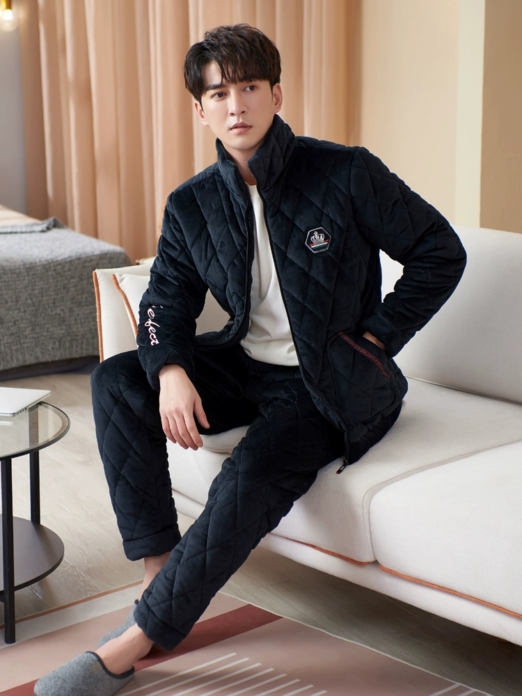 Men's pajamas autumn and winter thickened plus velvet coral velvet three-layer quilted jacket flannel can be worn outside home clothes set