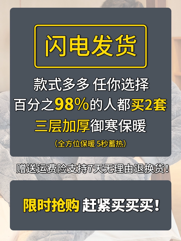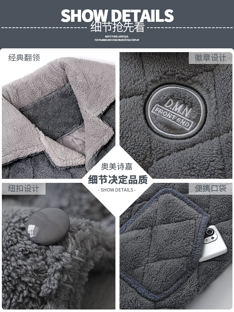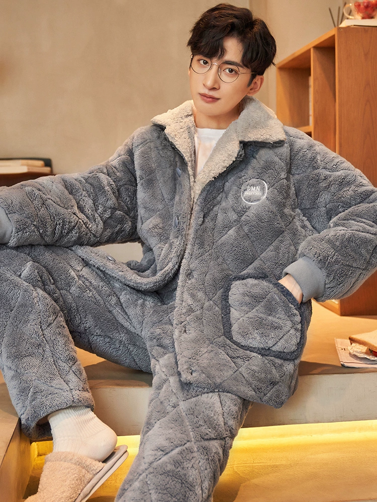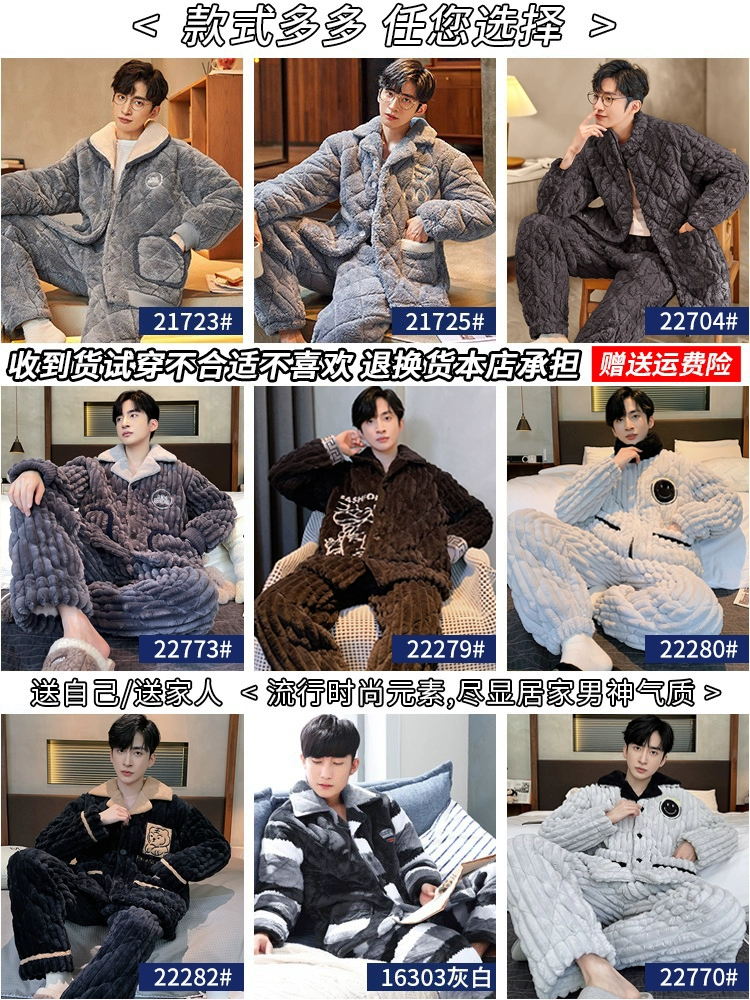 Men's pajamas coral velvet autumn and winter three-layer quilted thickened plus velvet warm flannel youth home wear set