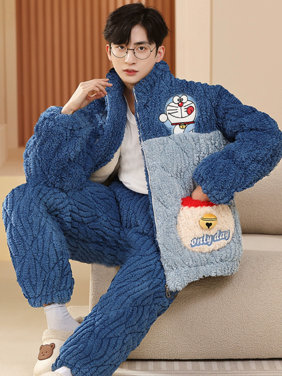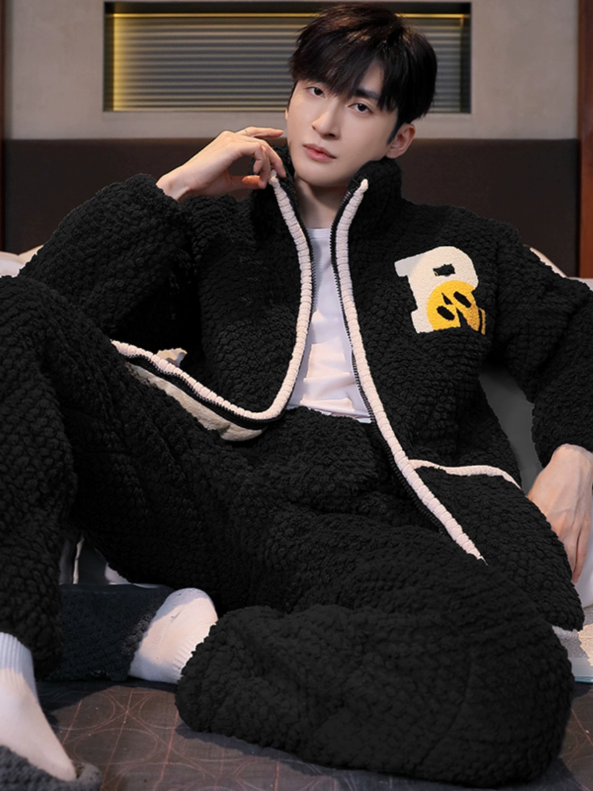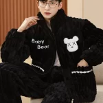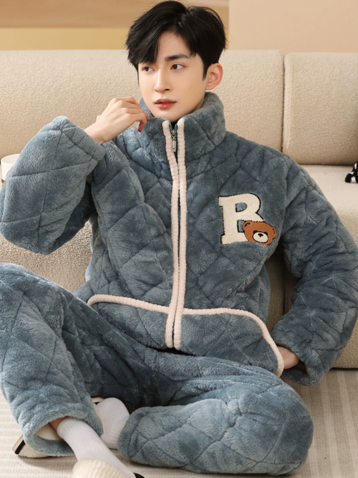 Men's pajamas winter three-layer thickened plus velvet coral fleece quilted youth plus size zipper home wear set