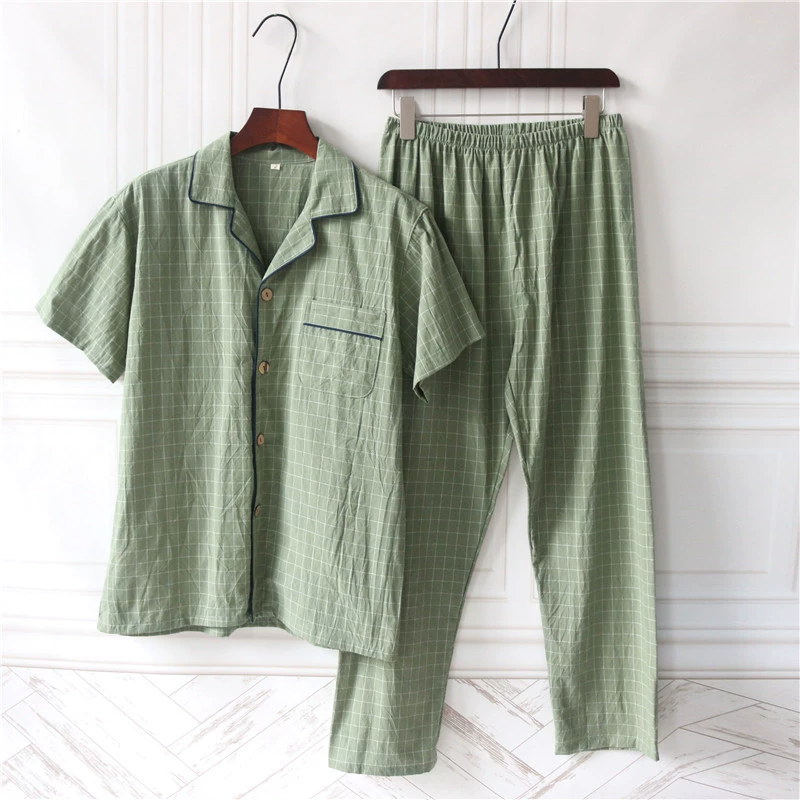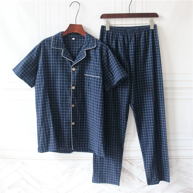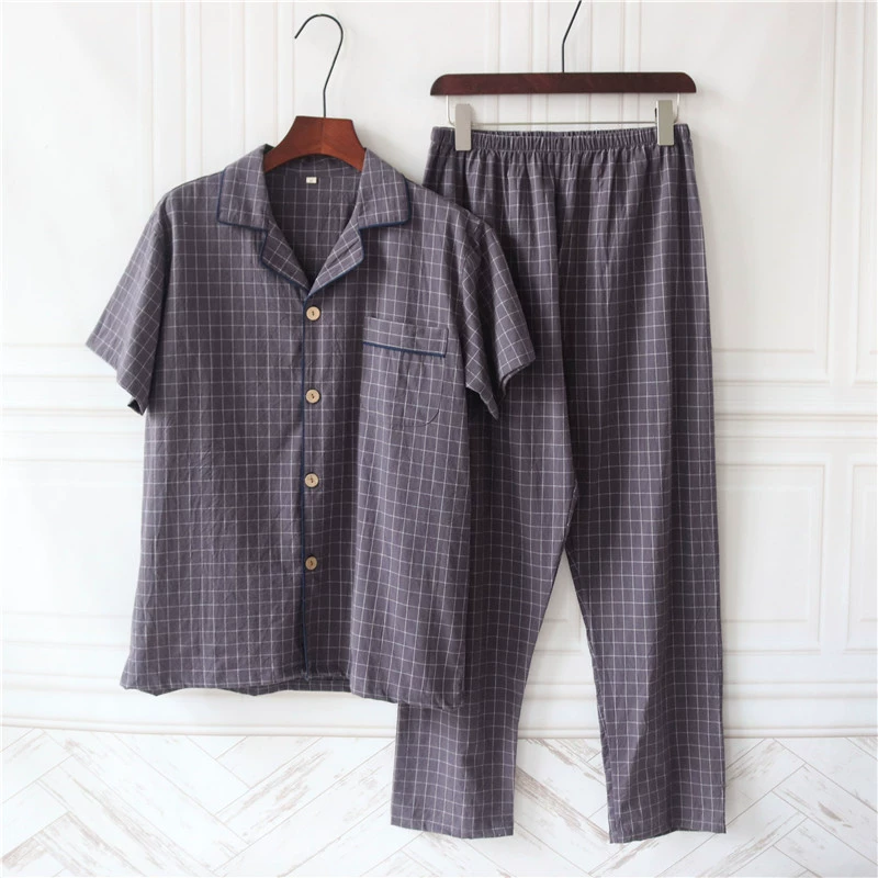 Men's short-sleeved trousers simple plaid cotton pajamas