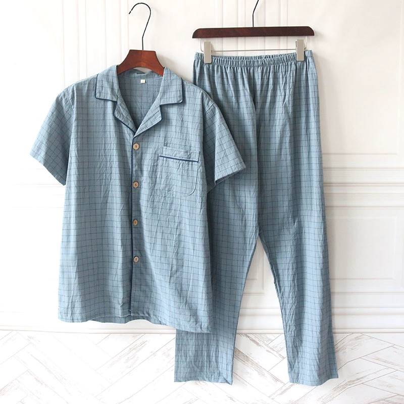 Men’s short -sleeved long -sleeved long lattice full cotton pajamas