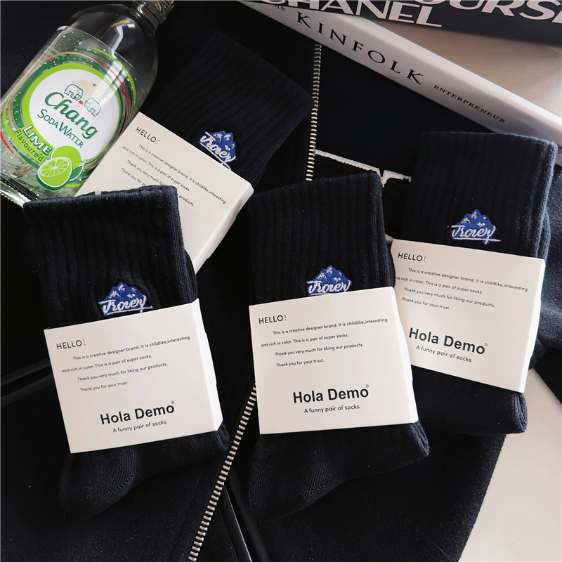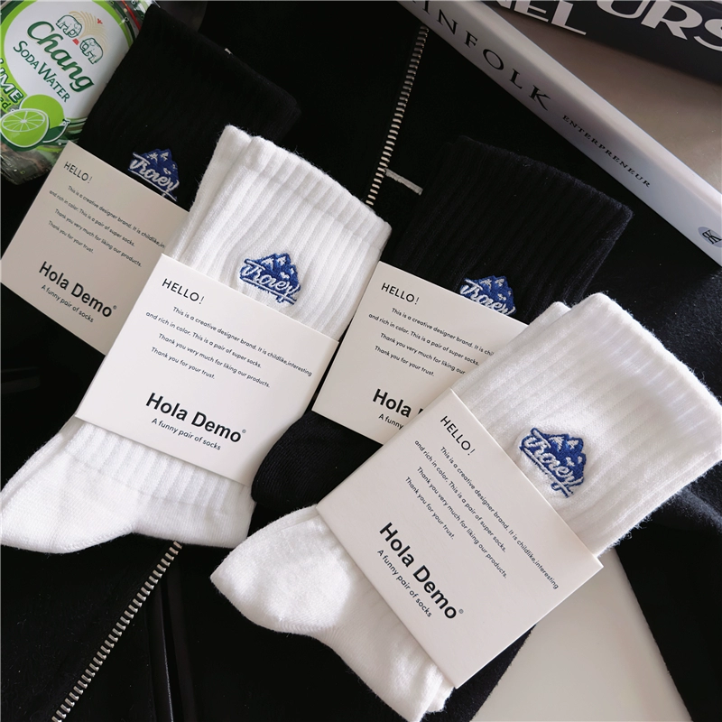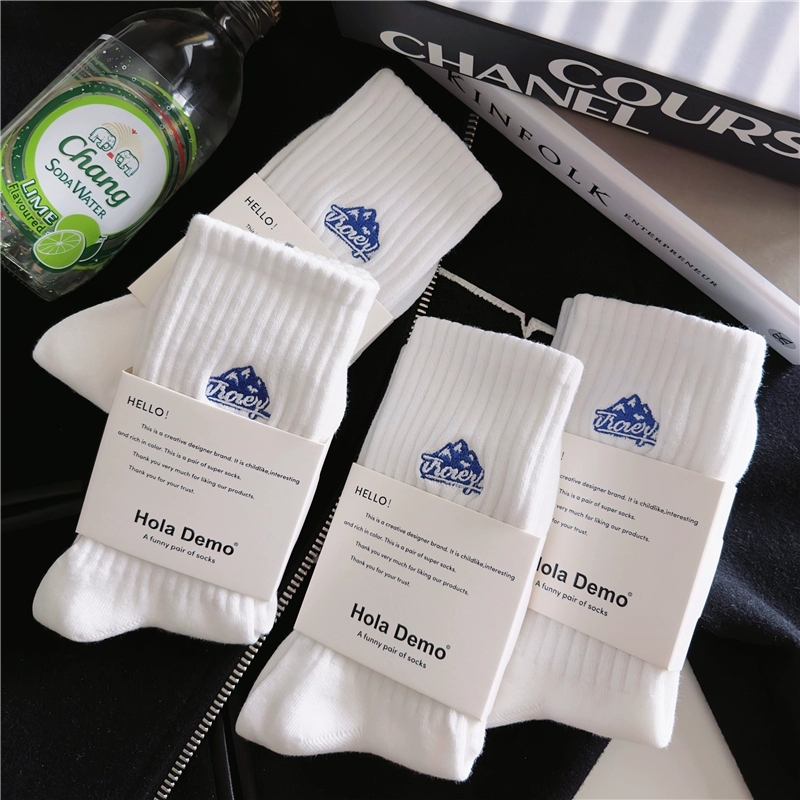 Men’s socks trendy mid-calf socks pure cotton snow mountain embroidery mid-top sports socks breathable sweat-absorbent white stockings for boys