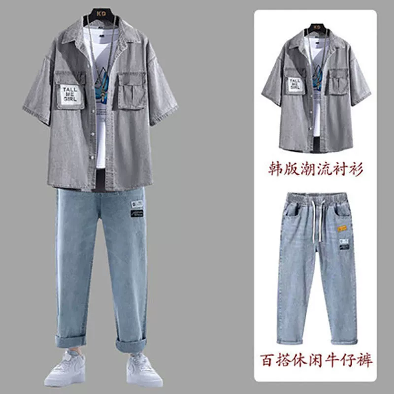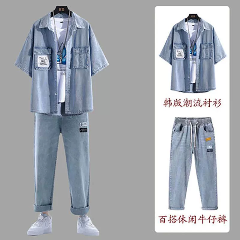 Men's summer short-sleeved denim shirt, thin quarter-sleeved jeans, a set with handsome casual suit shirt