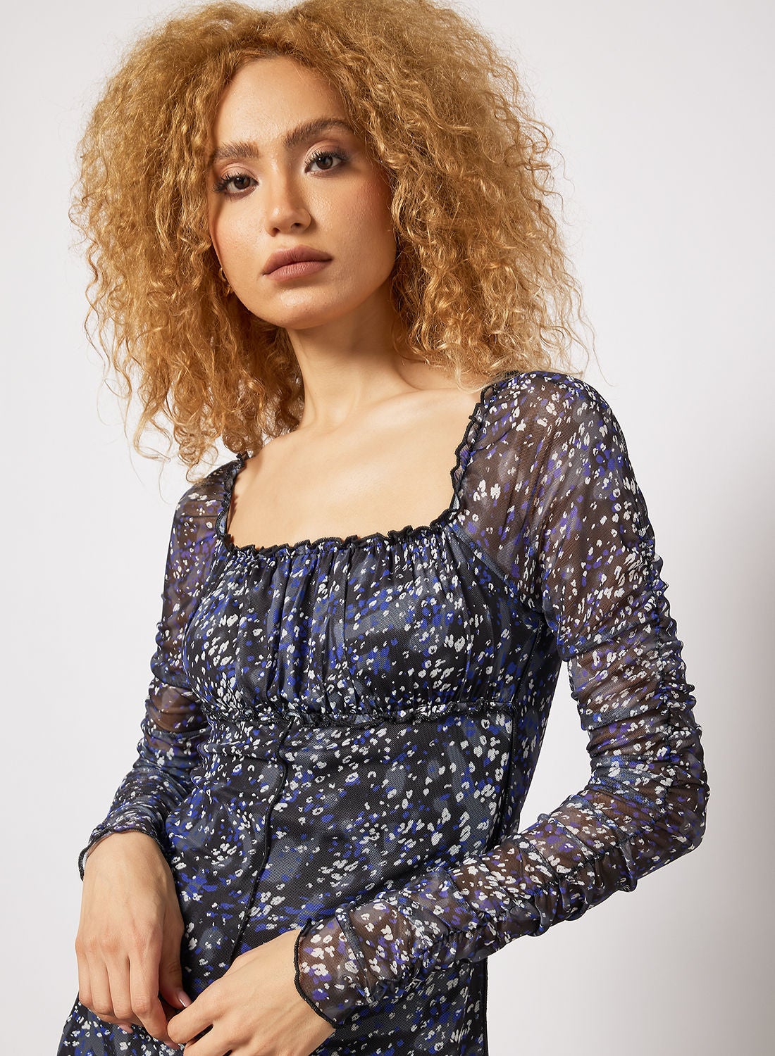 This product features a mesh fabric made of a blend of polyester that can stretch. It comes with a lining for added comfort. The fabric is adorned with a striking abstract print that covers the entire garment. The dress has a pleated square neckline and semi-transparent sleeves. It is designed to be body-hugging and has a mini length. The care label instructions should be followed when washing this dress. The model in the picture is approximately 176 cm tall and is wearing a size 36.