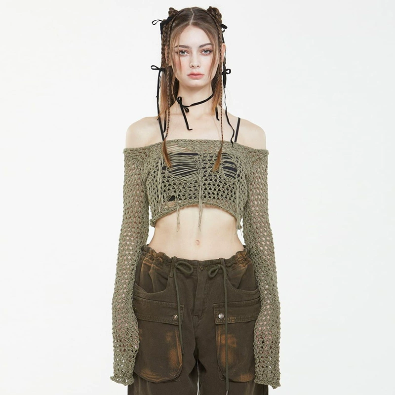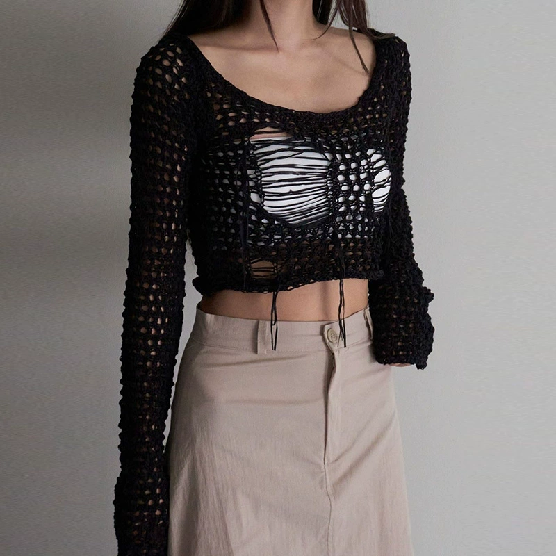 Mesh Hollow Knitted Autumn Slim Fit Long Sleeve Blouse