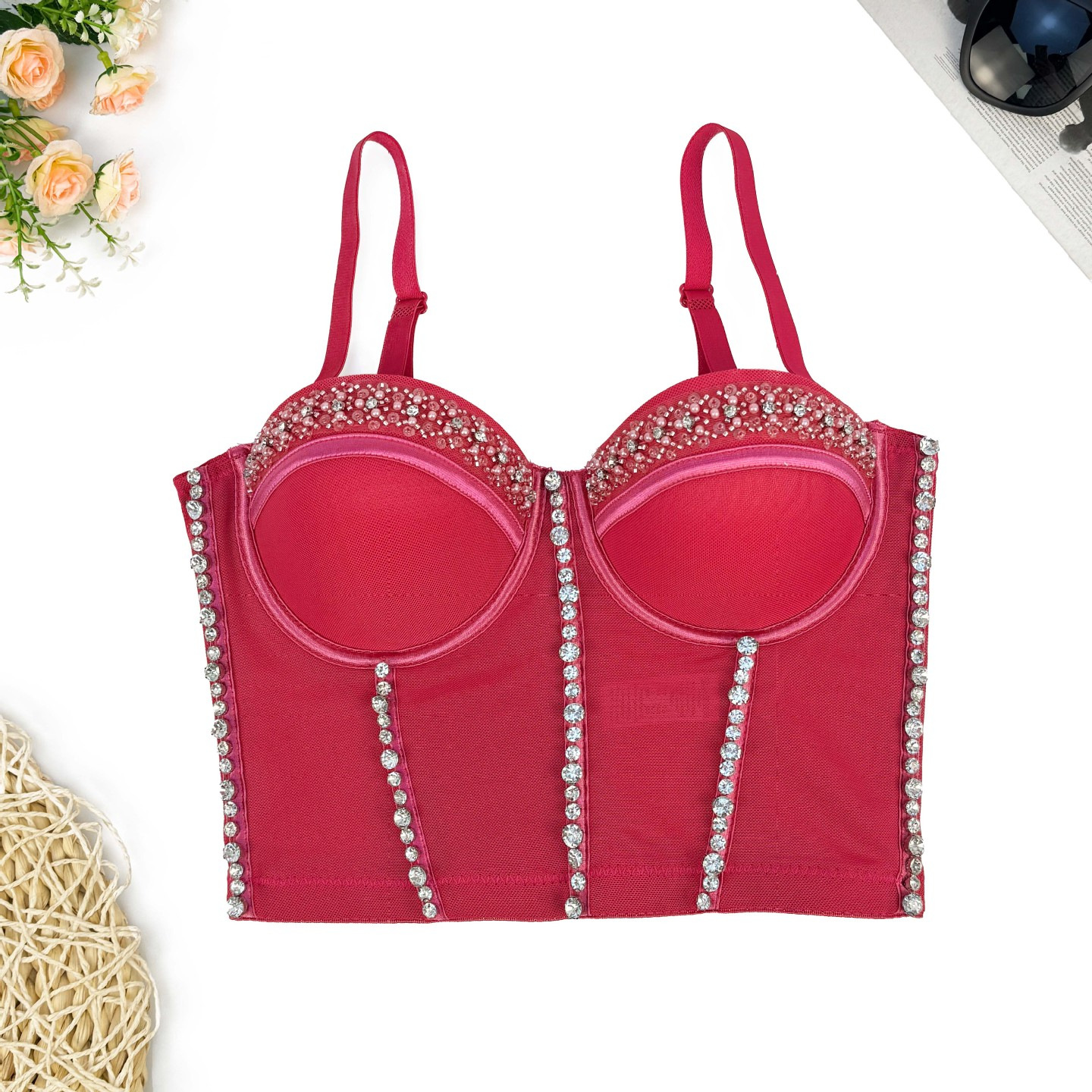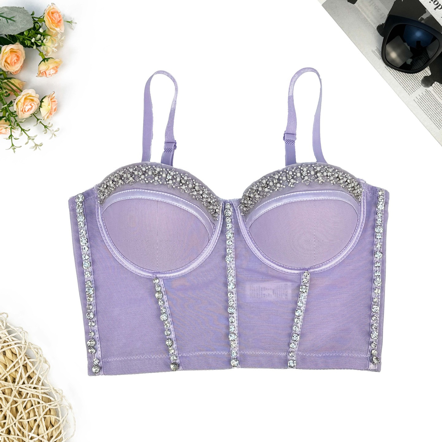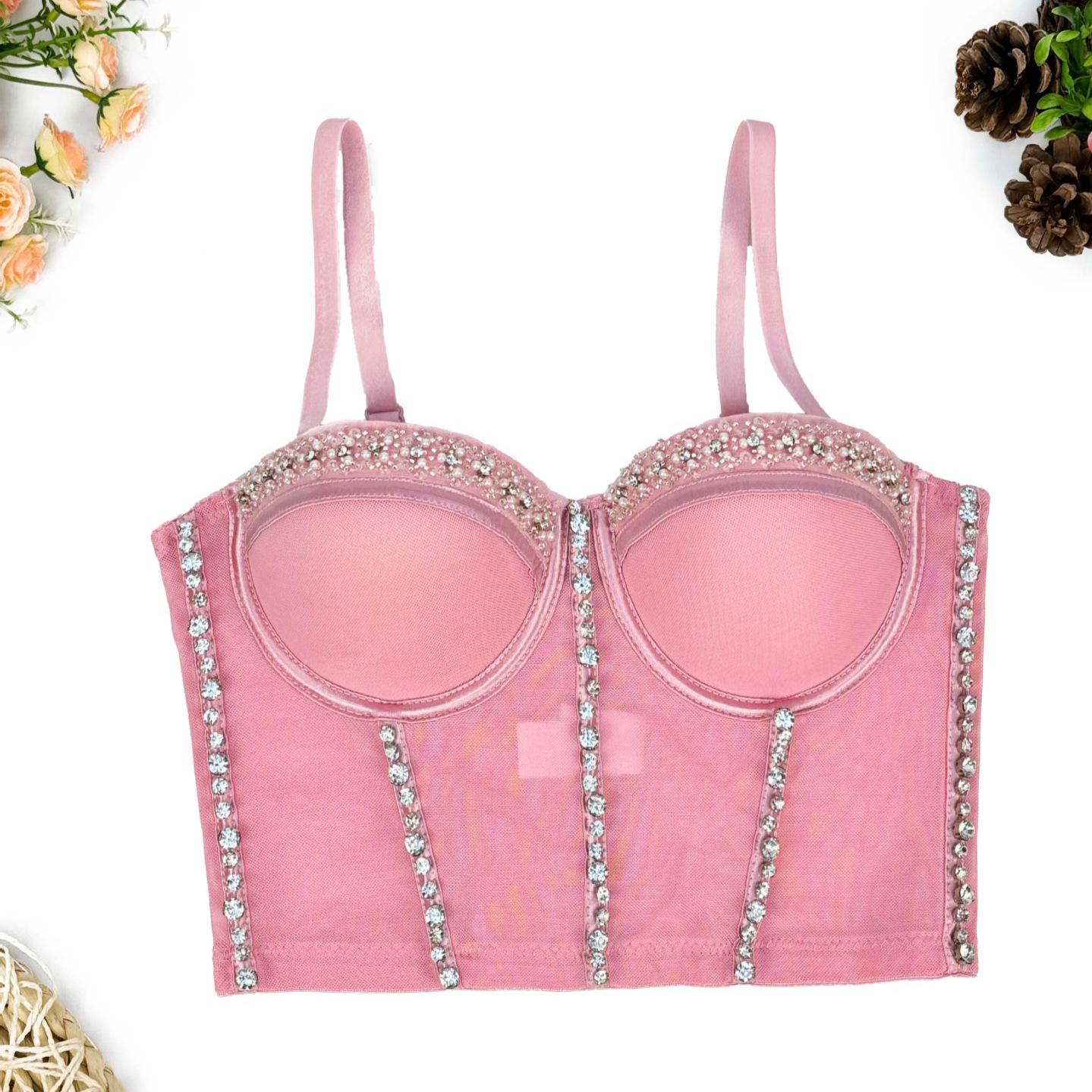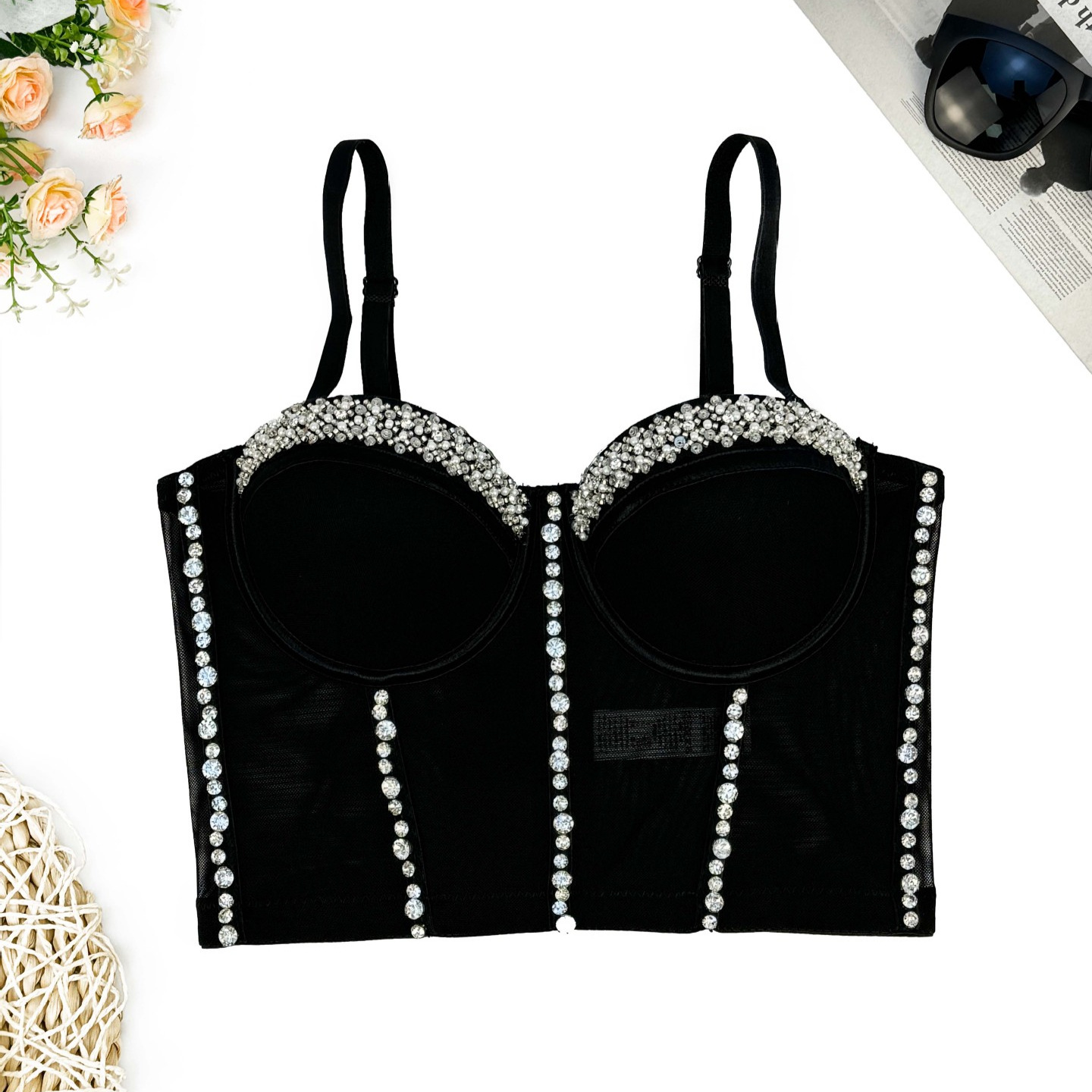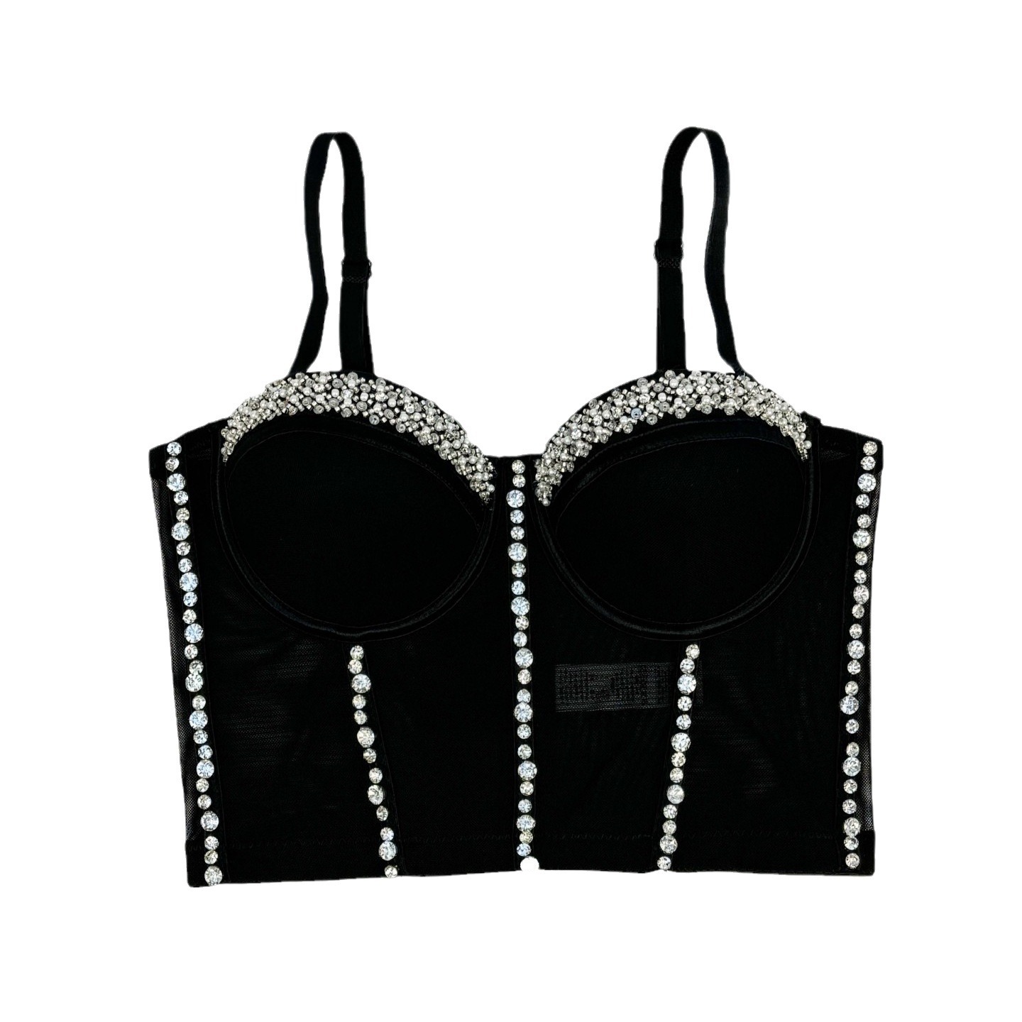 Mesh lace back underwear women’s thin Amazon new elastic strap Fishbone bra outer wear beaded tube top