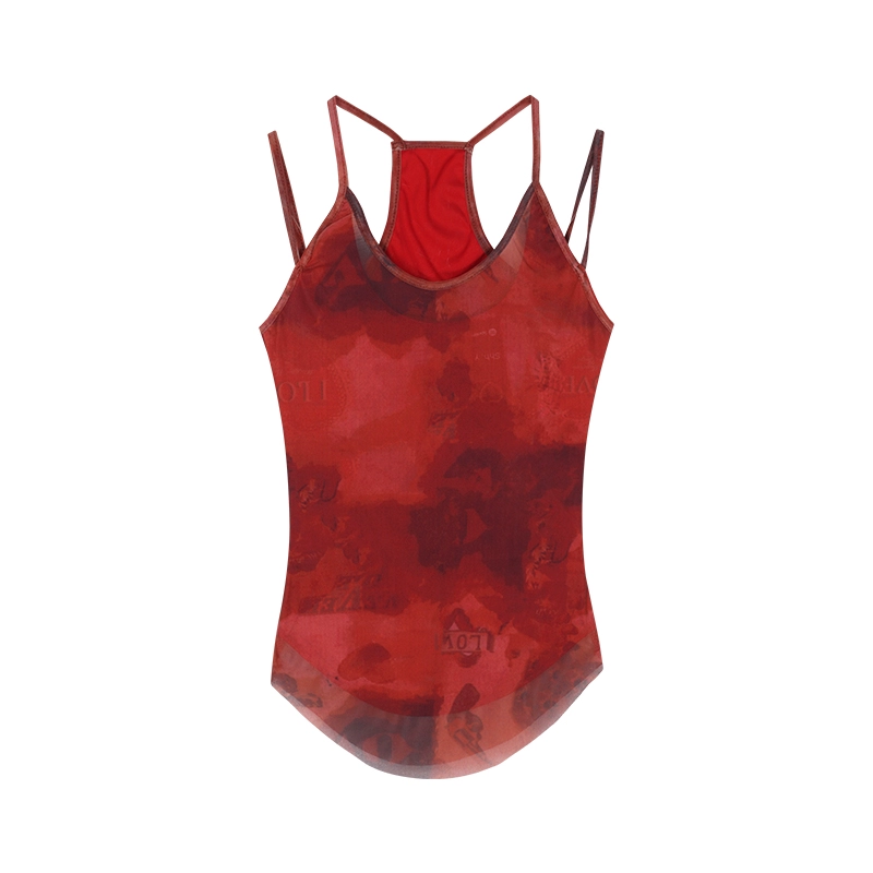 Mesh printed halterneck slim fit sleeveless red fake two piece