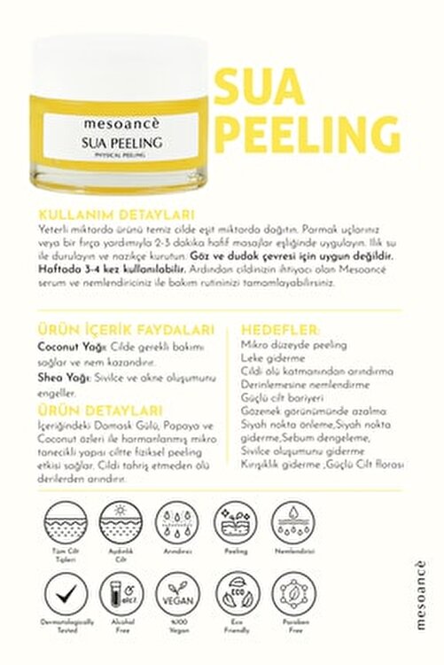 Usage: Distribute a sufficient amount of the product evenly over clean skin. Apply with your fingertips or with the help of a brush, accompanied by light massages for 2-3 minutes. Rinse with warm water and gently dry. Not suitable for eye and lip area. It can be used 3-4 times a week. Then you can complete your care routine with your Mesoancé serum and moisturizer your skin needs.