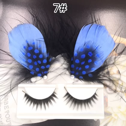 Metallic colored feathers with diamond false eyelashes, eye tail extensions, exaggerated and thick Latin dance performance COS masquerade
