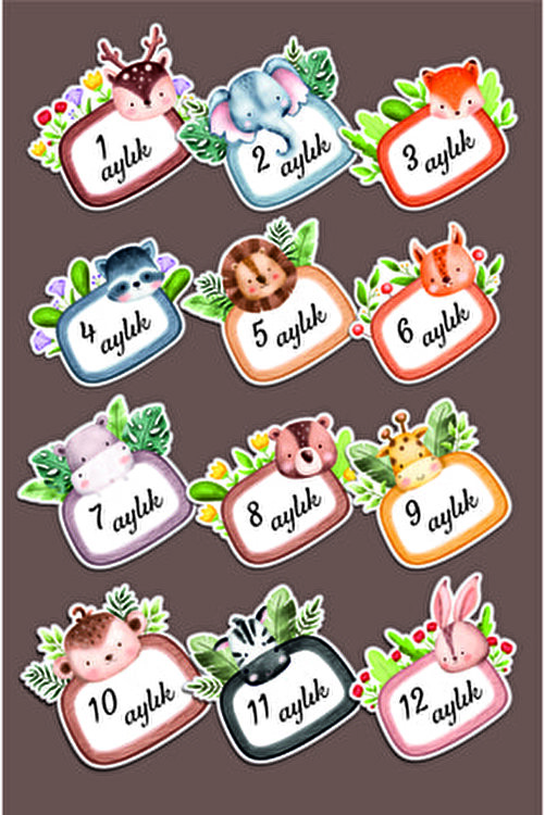 mevaks Monthly Baby Cards Cute Animals Turkish 12 Pieces Wooden