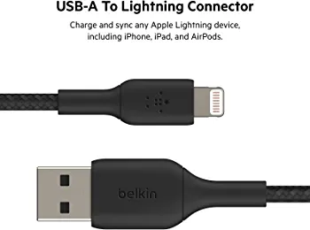 Introducing the Belkin Boost Charge Braided Lightning to USB-A Cable, designed to charge and sync your Apple devices with ease. This MFi-certified cable is compatible with a range of Apple devices, including iPhone 11, 11 Pro, 11 Pro Max, XS, XS Max, XR, X, 8, 8 Plus, 7, 7 Plus, 6, 6 Plus, iPad, iPad mini, iPad Pro (2017 and earlier), AirPods, AirPods 2, and AirPods Pro.