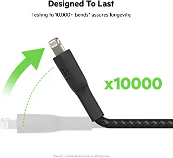 Charge and sync your iPhone and iPad, or transfer music, photos, and data from any USB-A port with an MFi-certified connection. Enhanced braided nylon provides long-lasting durability as well as a premium look and feel to complement your devices. Testing to 10000+ bends* assures longevity.