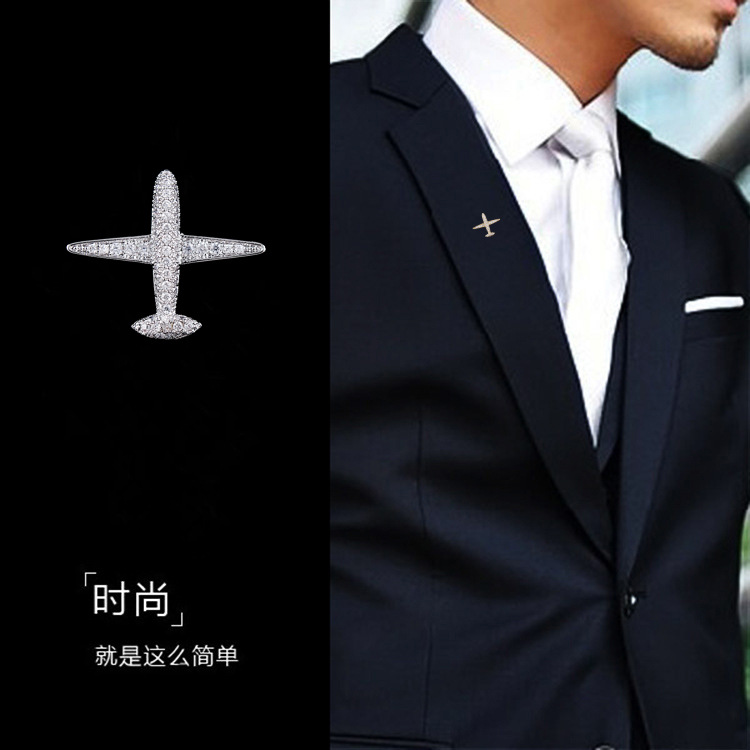 Micro-inlaid zircon small aircraft men's brooch collar pin gold plated high-grade crystal suit decorative anti-light buckle