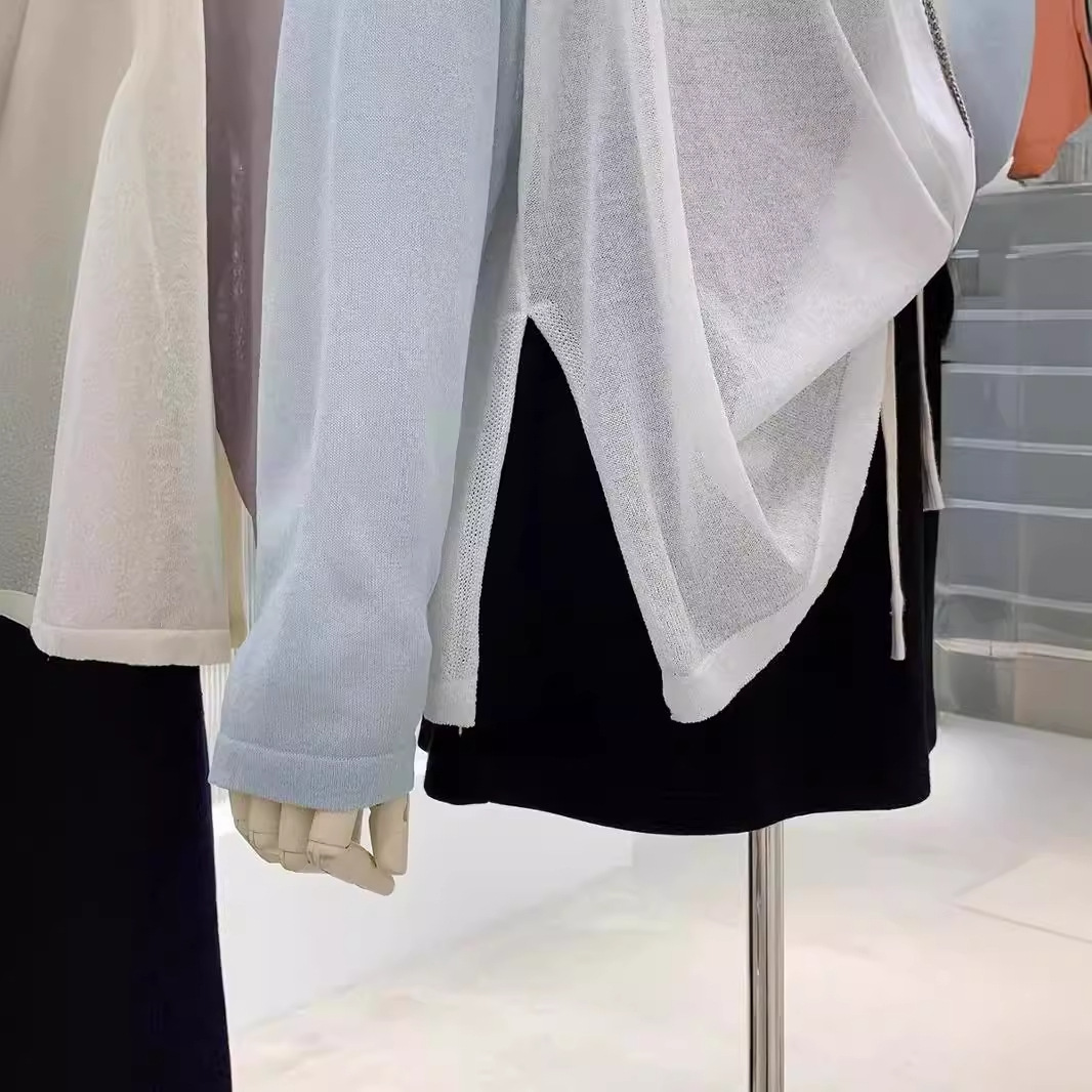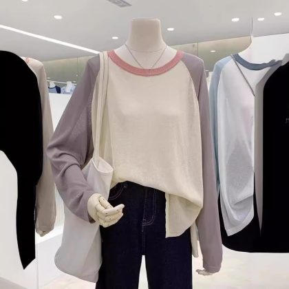 Micro-transparent sunscreen T-shirt slimming contrast color round neck raglan sleeve sweater women’s lazy thin long sleeve top