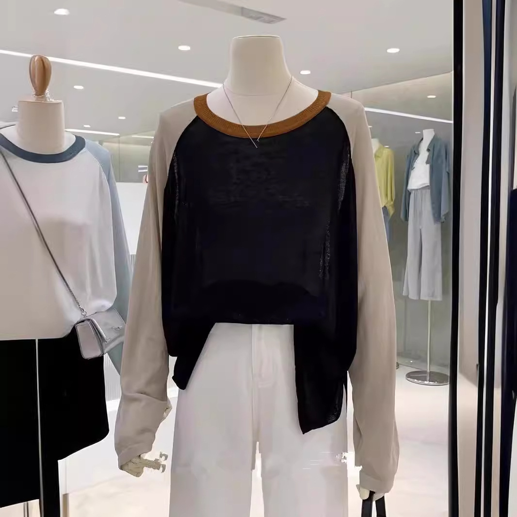 Micro-transparent sunscreen T-shirt slimming contrast color round neck raglan sleeve sweater women's lazy thin long sleeve top