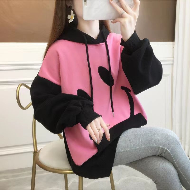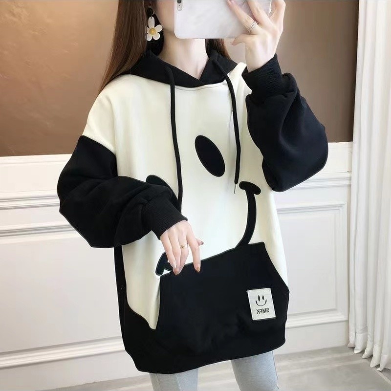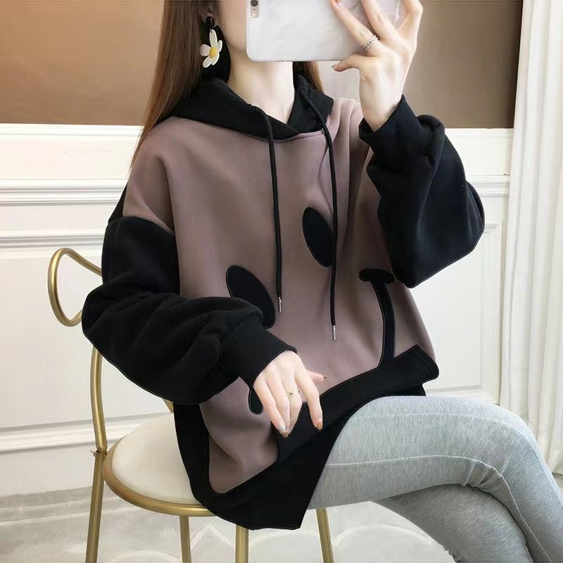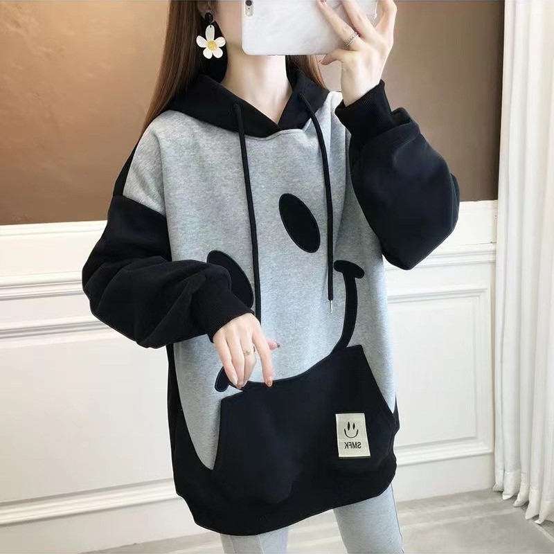 | nameOriginal | Mid-length Autumn and Winter New fleece-lined Thickened Loose Hooded Contrast Color Sweat Women's Big Smiley Women's Long-sleeved Top Trendy |