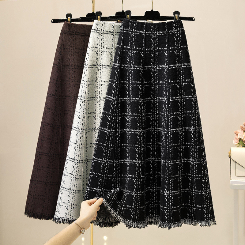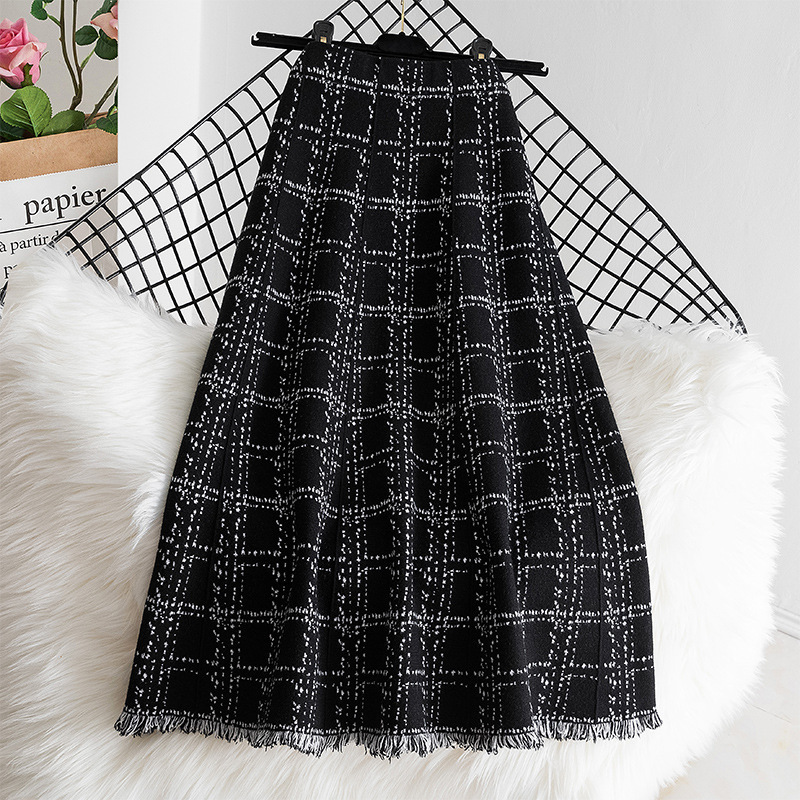 | nameOriginal | Mid-length Knitted Skirt Women's Autumn and Winter New Plaid High Waist Large Swing Skirt Over-knee A- line Tassel Wool Umbrella Skirt |