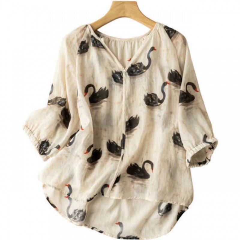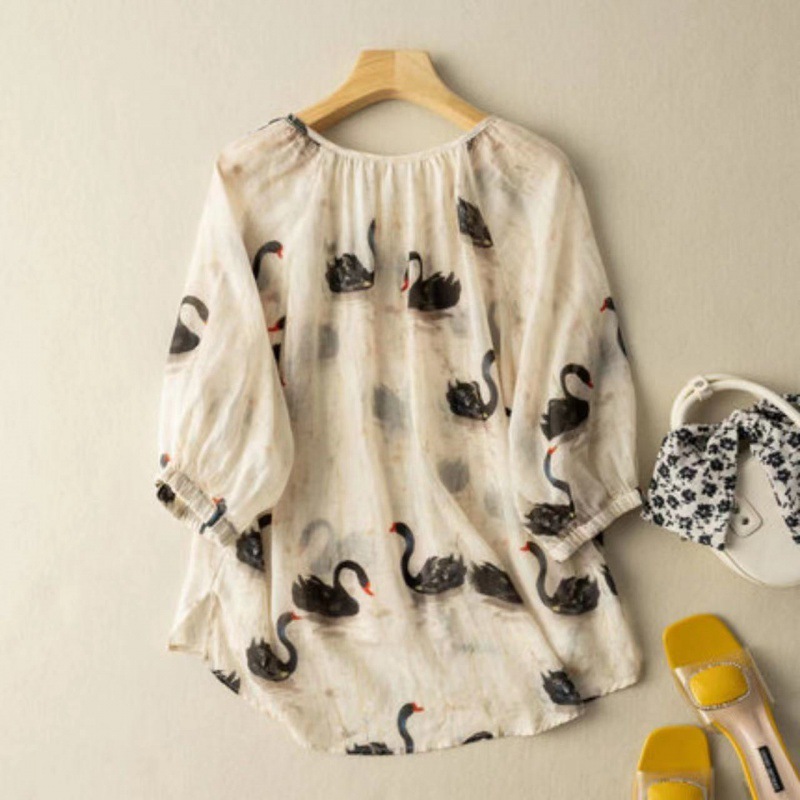 | nameOriginal | Mid-Sleeve Ramie Shirt Swan Print 2024 Summer New Thin Cotton Linen Top Loose Beautiful Shirt |