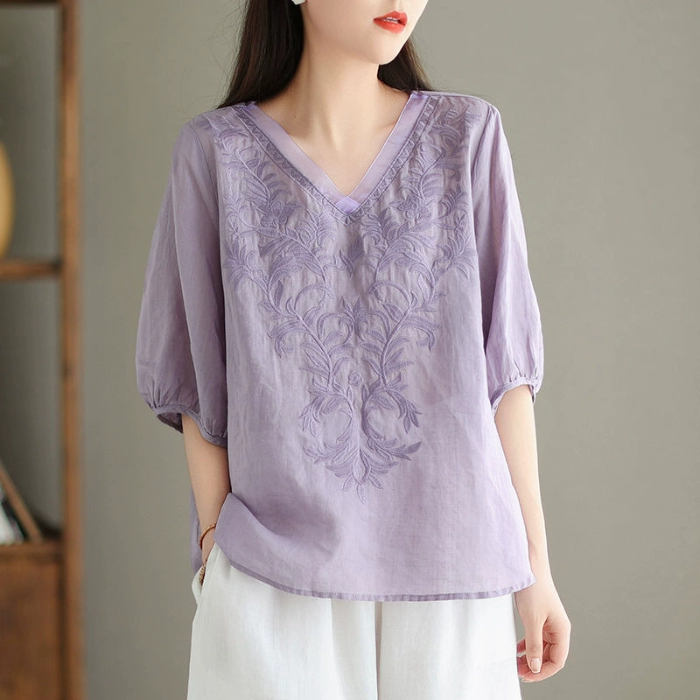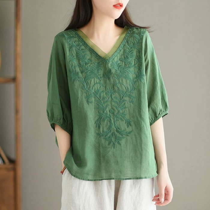| nameOriginal | Mid-sleeve V-neck heavy embroidery casual cotton and linen shirt |