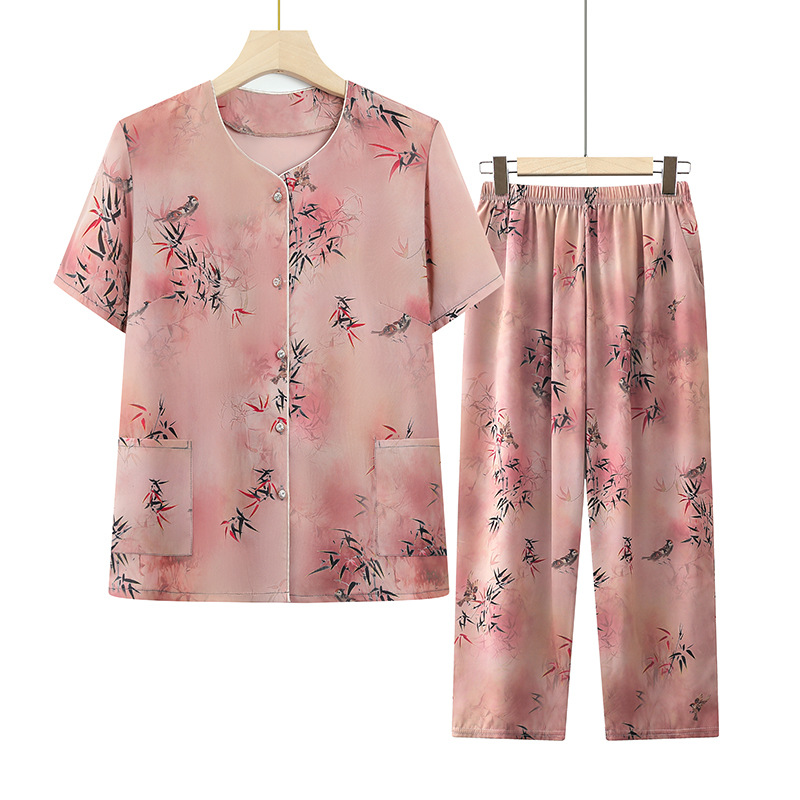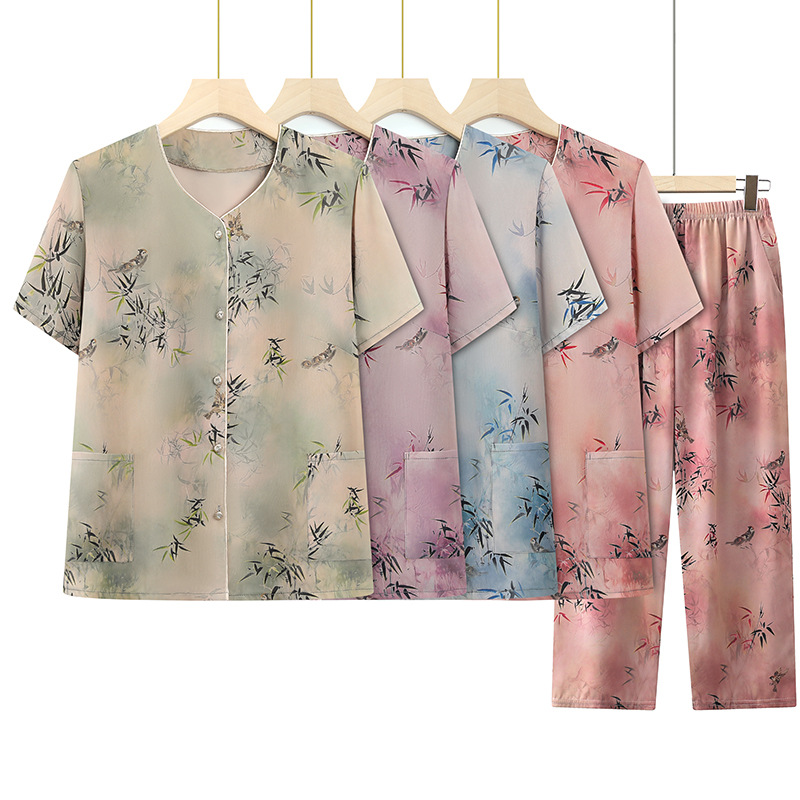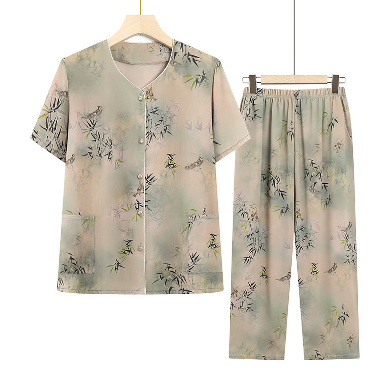 | nameOriginal | Middle-aged and elderly summer loose cool suit bamboo leaf bird printed short sleeve top straight pants grandma 2-piece set |