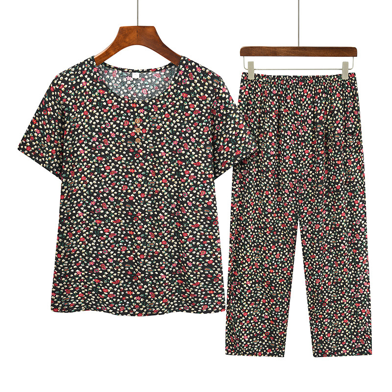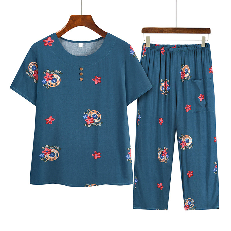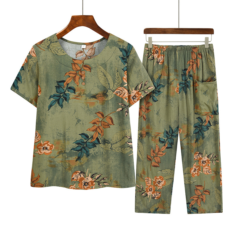 Middle-aged and Elderly Summer suit Mother's Short-sleeved Top Grandma's Loose Cotton Two-piece Casual Dress for Old Lady