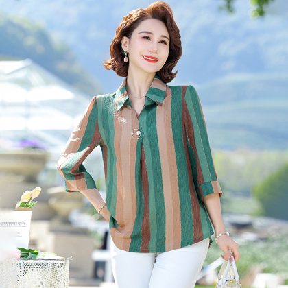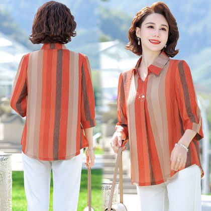 Middle-aged and elderly women’s summer new lapel sleeve shirt top mother’s elegant comfortable T-shirt striped shirt
