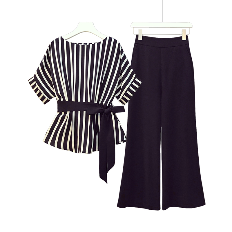 | nameOriginal | Middle-aged fat mother summer new suit women's middle-aged and elderly plus-size striped top wide leg pants two-piece set |