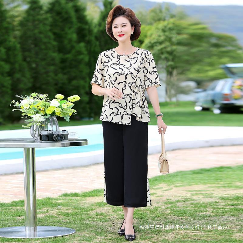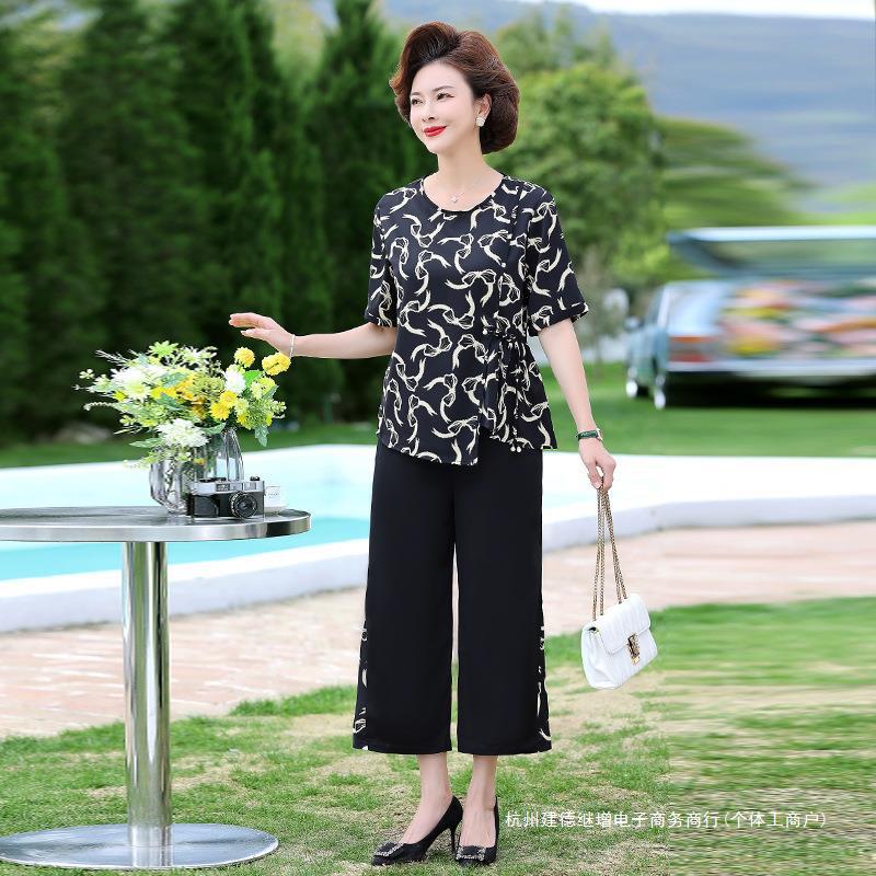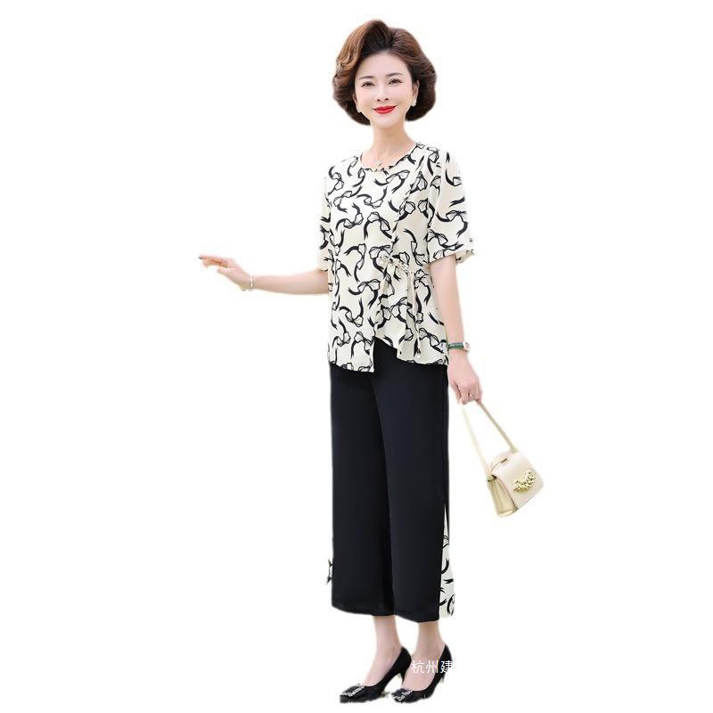 | nameOriginal | Middle-aged mother summer chiffon suit fashion western style middle-aged women's short sleeve thin top wide leg pants two-piece set |