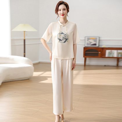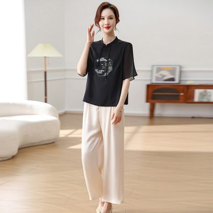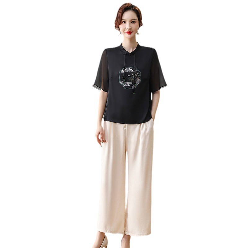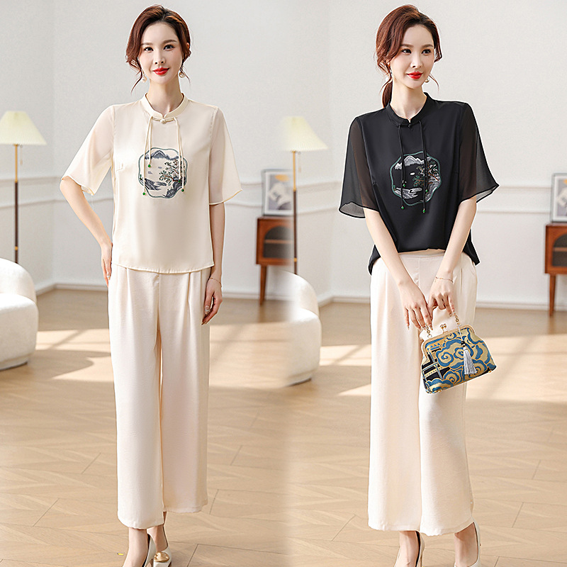 | nameOriginal | Middle-aged mother summer chiffon suit foreign style new Chinese ladies summer short sleeve fashion two-piece 2024 new |