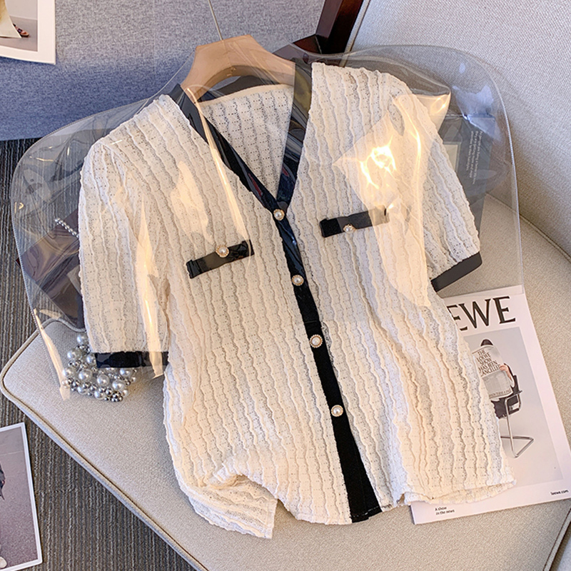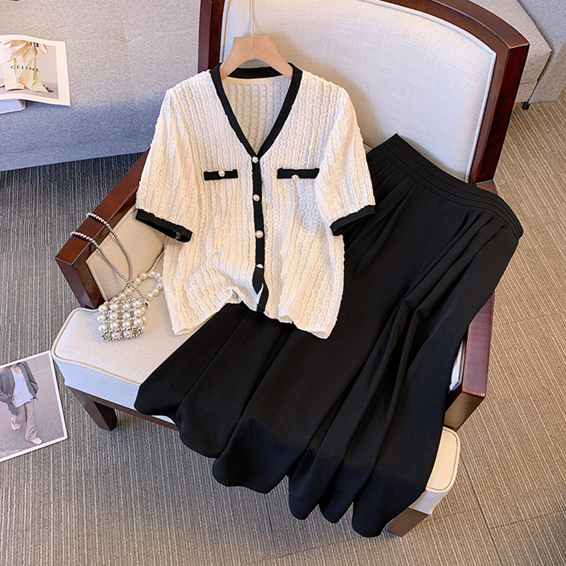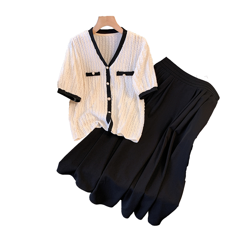 | nameOriginal | Middle-aged mother summer fashion V-neck knitted cardigan suit plus size short sleeve top A- line skirt two-piece set |