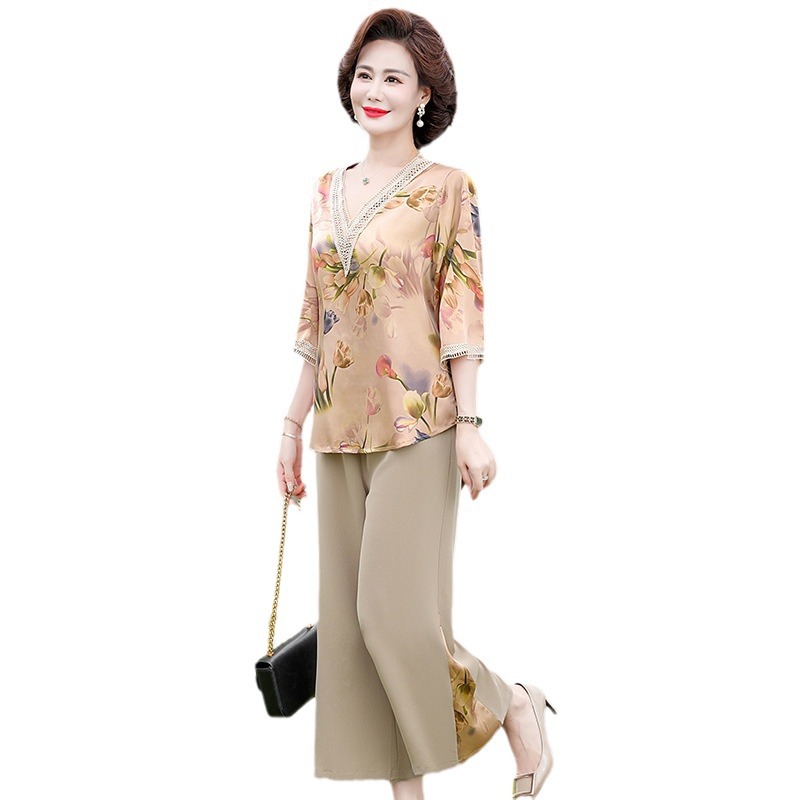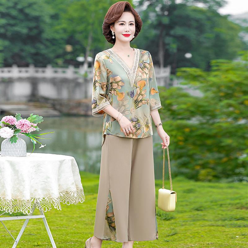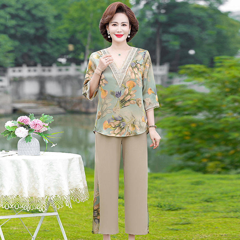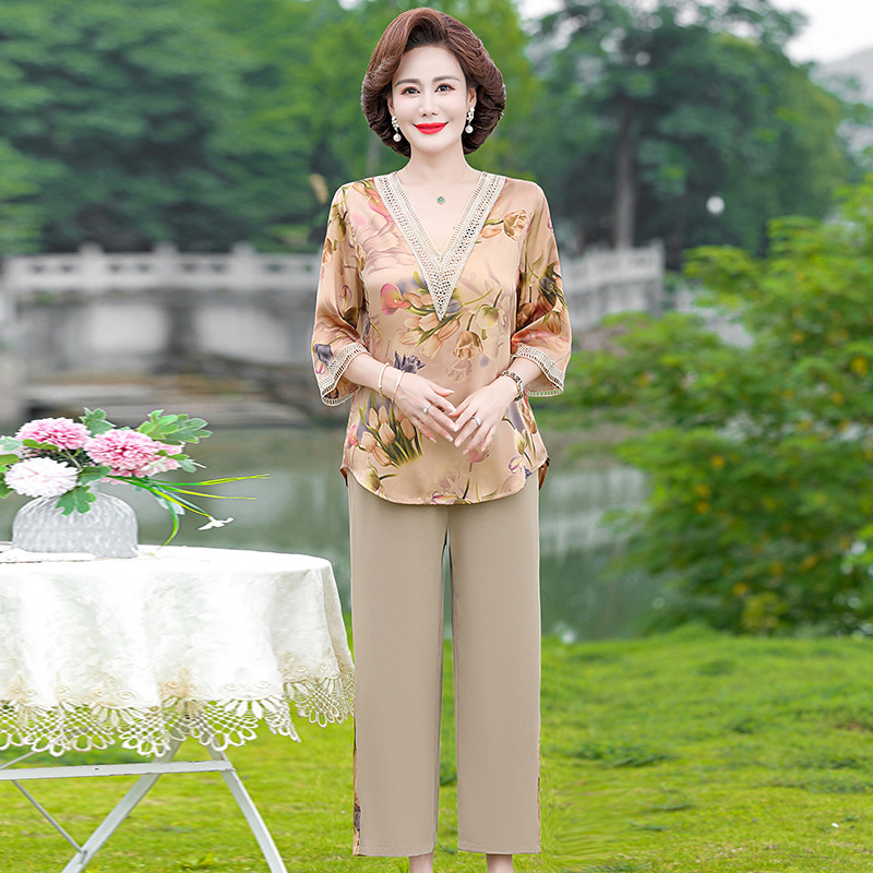 | nameOriginal | Middle-aged mother summer top foreign-style belly-covering elegant shirt suit new seven-sleeve middle-aged and elderly women's two-piece suit |