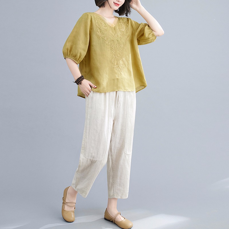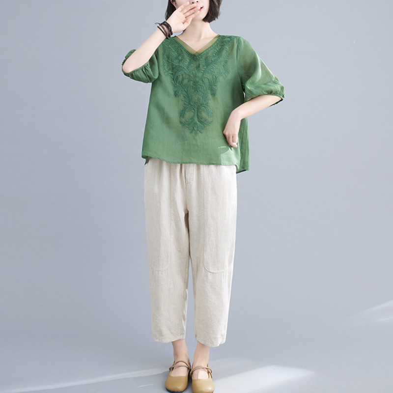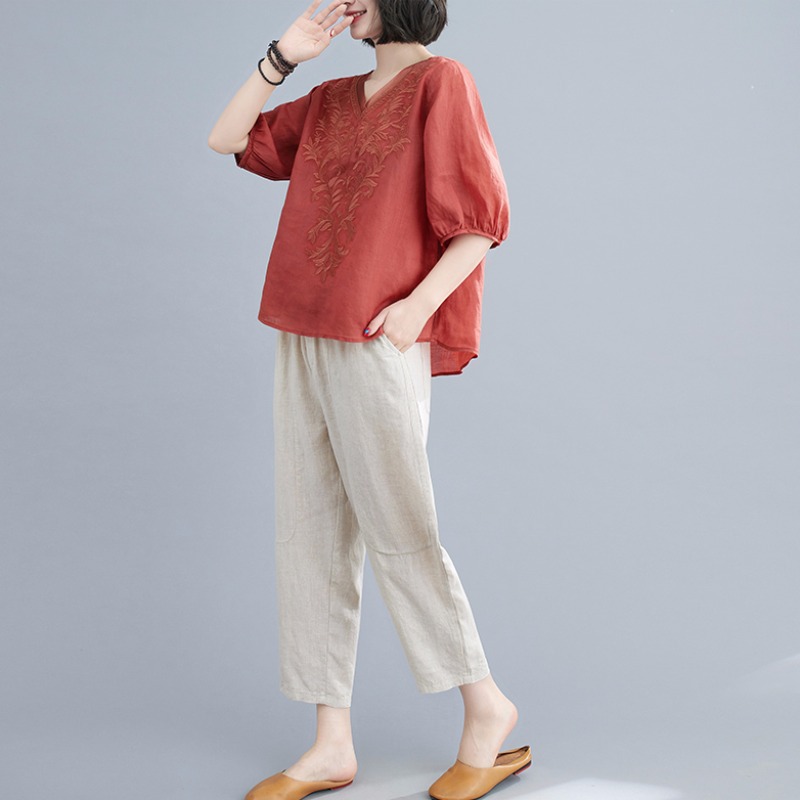 Middle-aged mother’s 2024 spring new short-sleeved top summer middle-aged and elderly women’s embroidered cotton and linen two-piece suit