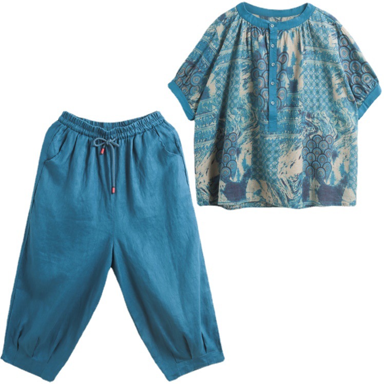 Middle-aged mother’s 2024 summer new middle-aged and elderly women’s linen short-sleeved top cotton and linen two-piece suit foreign style