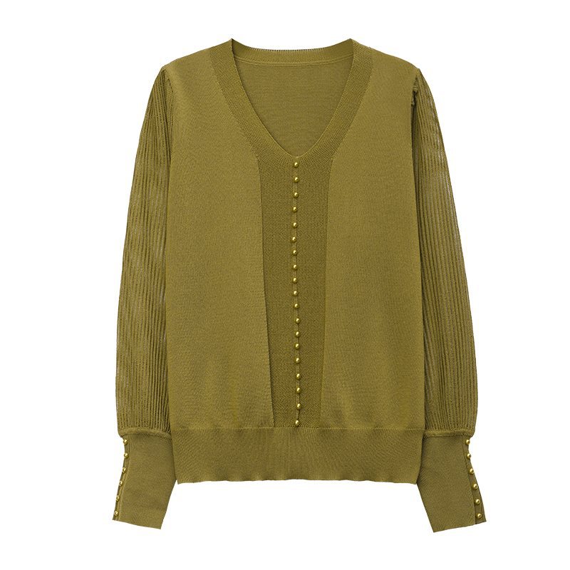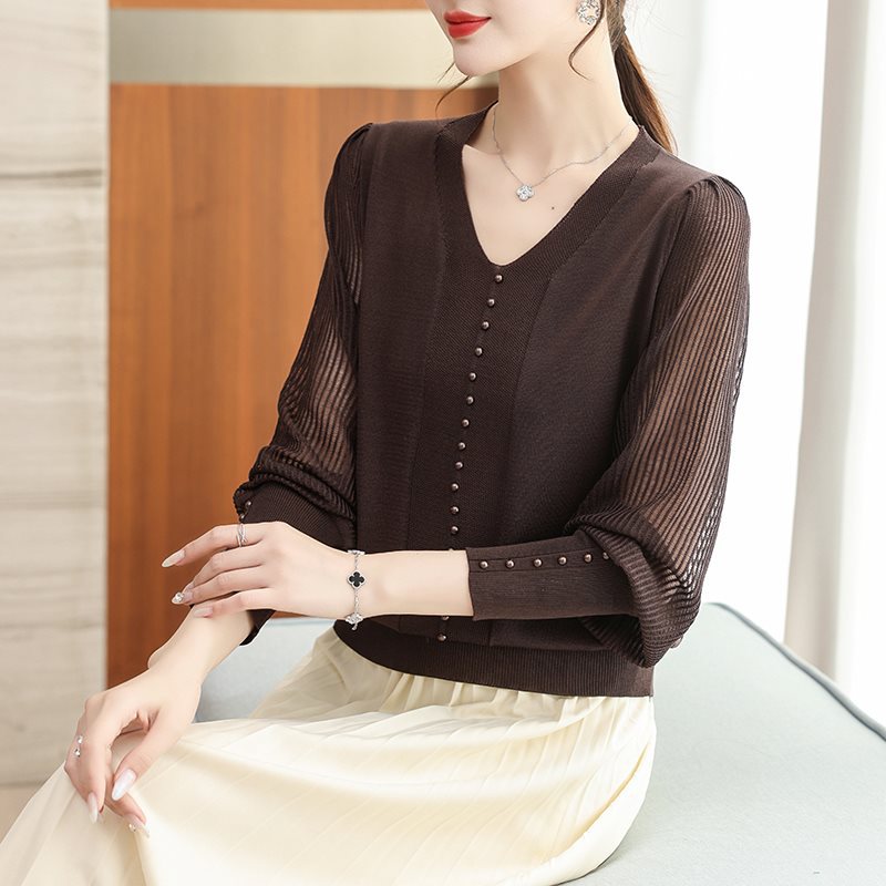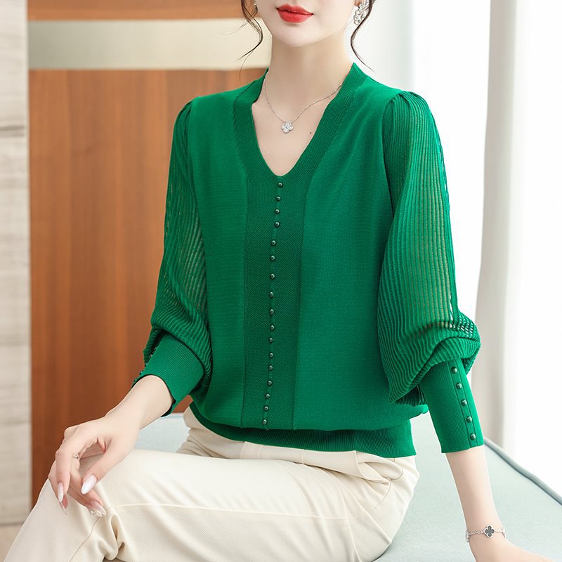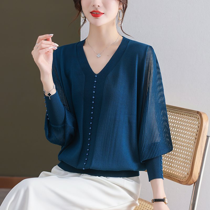 | nameOriginal | Middle-aged Mother's Spring and Summer Ice Silk Knitted Sweater Women's plus size Women's Thin V-neck Long-sleeved T-shirt Yarn-sleeved Small Shirt |